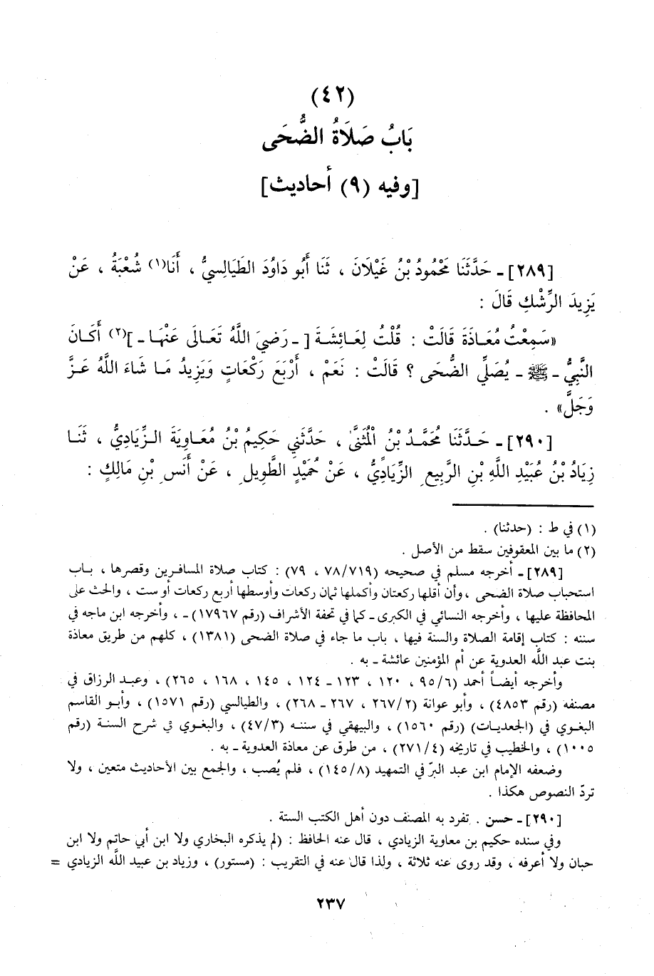 290 - حَدَّثَنَا مُحَمَّدُ بْنُ الْمُثَنَّى قَالَ: حَدَّثَنِي حَكِيمُ بْنُ مُعَاوِيَةَ الزِّيَادِيُّ قَالَ: حَدَّثَنَا زِيَادُ بْنُ عُبَيْدِ اللَّهِ بْنِ الرَّبِيعِ الزِّيَادِيُّ، عَنْ حُمَيْدٍ الطَّوِيلِ، عَنْ أَنَسِ بْنِ مَالِكٍ -[238]-: «أَنَّ النَّبِيَّ صَلَّى اللهُ عَلَيْهِ وَسَلَّمَ كَانَ §يُصَلِّي الضُّحَى سِتَّ رَكَعَاتٍ»