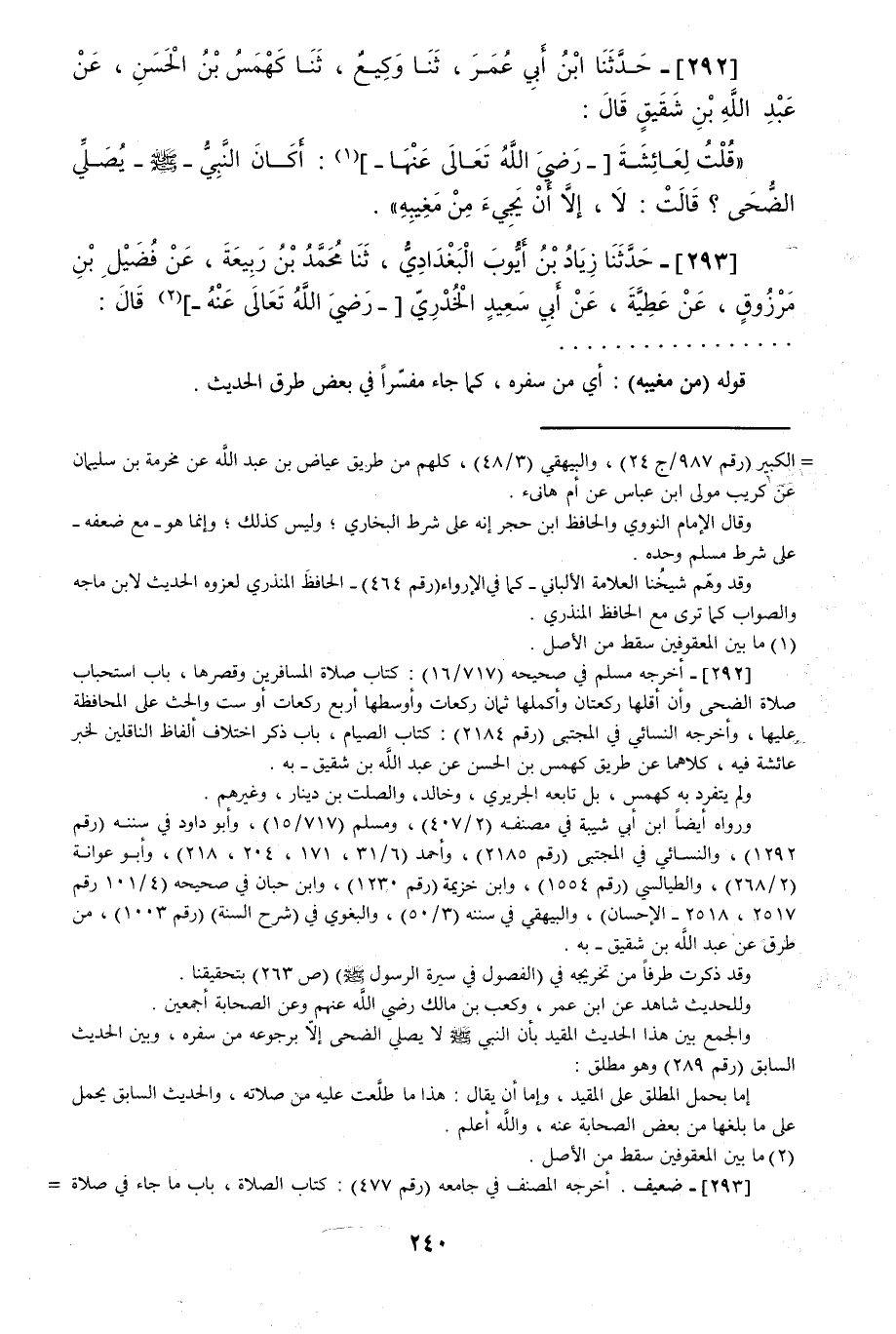 292 - حَدَّثَنَا ابْنُ أَبِي عُمَرَ قَالَ: حَدَّثَنَا وَكِيعٌ قَالَ: حَدَّثَنَا كَهْمَسُ بْنُ الْحَسَنِ، عَنْ عَبْدِ اللَّهِ بْنِ شَقِيقٍ قَالَ: قُلْتُ لِعَائِشَةَ: §أَكَانَ النَّبِيُّ صَلَّى اللهُ عَلَيْهِ وَسَلَّمَ يُصَلِّي الضُّحَى؟ قَالَتْ: «لَا إِلَا أَنْ يَجِيءَ مِنْ مَغِيبِهِ»