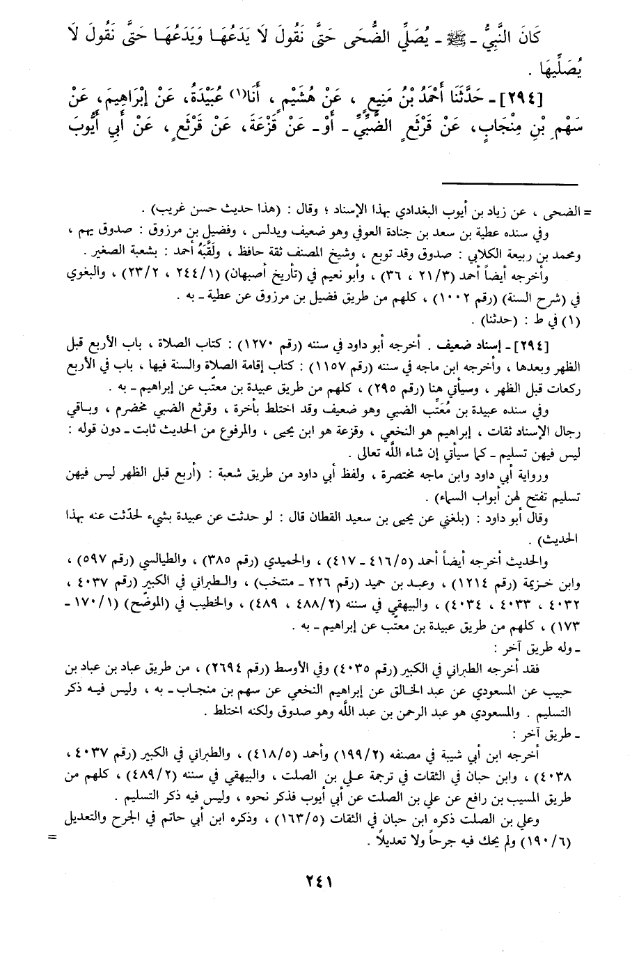 295 - حَدَّثَنَا أَحْمَدُ بْنُ مَنِيعٍ، عَنْ هُشَيْمٍ قَالَ: حَدَّثَنَا عُبَيْدَةُ، عَنِ إِبْرَاهِيمَ، عَنْ سَهْمِ بْنِ مِنْجَابٍ، عَنْ قَرْثَعٍ الضَّبِّيِّ، أَوْ عَنْ قَزَعَةَ، عَنْ قَرْثَعٍ، عَنْ أَبِي أَيُّوبَ -[242]- الْأَنْصَارِيِّ، أَنَّ النَّبِيَّ صَلَّى اللهُ عَلَيْهِ وَسَلَّمَ كَانَ يُدْمِنُ أَرْبَعَ رَكَعَاتٍ عِنْدَ زَوَالِ الشَّمْسِ فَقُلْتُ: يَا رَسُولَ اللَّهِ، إِنَّكَ تُدْمِنُ هَذِهِ الْأَرْبَعَ رَكَعَاتٍ عِنْدَ زَوَالِ الشَّمْسِ فَقَالَ: «إِنَّ §-[243]- أَبْوَابَ السَّمَاءِ تُفْتَحُ عِنْدَ زَوَالِ الشَّمْسِ فَلَا تُرْتَجُ حَتَّى تُصَلَّى الظُّهْرُ، فَأُحِبُّ أَنْ يَصْعَدَ لِي فِي تِلْكَ السَّاعَةِ خَيْرٌ» قُلْتُ: أَفِي كُلِّهِنَّ قِرَاءَةٌ؟ قَالَ: «نَعَمْ» . قُلْتُ: هَلْ فِيهِنَّ تَسْلِيمٌ فَاصِلٌ؟ قَالَ: «لَا» أَخْبَرَنِي أَحْمَدُ بْنُ مَنِيعٍ قَالَ: حَدَّثَنَا أَبُو مُعَاوِيَةَ قَالَ: حَدَّثَنَا عُبَيْدَةُ، عَنِ إِبْرَاهِيمَ، عَنْ سَهْمِ بْنِ مِنْجَابٍ، عَنْ قَزَعَةَ، عَنْ قَرْثَعٍ، عَنْ أَبِي أَيُّوبَ الْأَنْصَارِيِّ، عَنِ النَّبِيِّ صَلَّى اللهُ عَلَيْهِ وَسَلَّمَ نَحْوَهُ