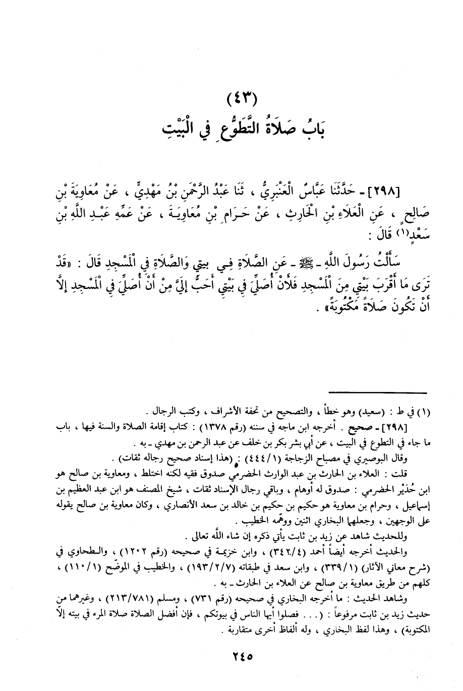 298 - حَدَّثَنَا عَبَّاسٌ الْعَنْبَرِيُّ قَالَ: حَدَّثَنَا عَبْدُ الرَّحْمَنِ بْنُ مَهْدِيٍّ، عَنْ مُعَاوِيَةَ بْنِ صَالِحٍ، عَنِ الْعَلَاءِ بْنِ الْحَارِثِ، عَنْ حَرَامِ بْنِ مُعَاوِيَةَ، عَنْ عَمِّهِ عَبْدِ اللَّهِ بْنِ سَعْدٍ قَالَ: سَأَلْتُ رَسُولَ اللَّهِ صَلَّى اللهُ عَلَيْهِ وَسَلَّمَ عَنِ الصَّلَاةِ فِي بَيْتِي وَالصَّلَاةِ فِي الْمَسْجِدِ قَالَ: «قَدْ تَرَى مَا أَقْرَبَ بَيْتِي مِنَ الْمَسْجِدِ، §فَلَأَنْ أُصَلِّيَ فِي بَيْتِي أَحَبُّ إِلَيَّ مِنْ أَنْ أُصَلِّيَ فِي الْمَسْجِدِ إِلَا أَنْ تَكُونَ صَلَاةً مَكْتُوبَةً»