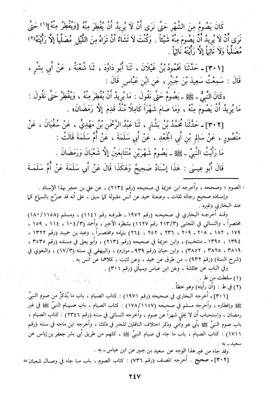 301 - حَدَّثَنَا مَحْمُودُ بْنُ غَيْلَانَ قَالَ: حَدَّثَنَا أَبُو دَاوُدَ قَالَ: حَدَّثَنَا شُعْبَةُ، عَنْ أَبِي بِشْرٍ قَالَ: سَمِعْتُ سَعِيدَ بْنَ جُبَيْرٍ، عَنِ ابْنِ عَبَّاسٍ قَالَ: «كَانَ النَّبِيُّ صَلَّى اللهُ عَلَيْهِ وَسَلَّمَ §يَصُومُ حَتَّى نَقُولَ مَا يُرِيدُ أَنْ يُفْطِرَ مِنْهُ، وَيُفْطِرُ حَتَّى نَقُولَ مَا يُرِيدُ أَنْ يَصُومَ مِنْهُ، وَمَا صَامَ شَهْرًا كَامِلَا مُنْذُ قَدِمَ الْمَدِينَةَ إِلَّا رَمَضَانَ»