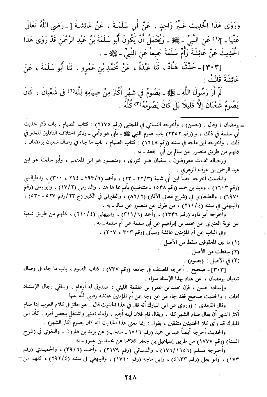 303 - حَدَّثَنَا هَنَّادٌ قَالَ: حَدَّثَنَا عَبْدَةُ، عَنْ مُحَمَّدِ بْنِ عَمْرٍو قَالَ: حَدَّثَنَا أَبُو سَلَمَةَ، عَنْ عَائِشَةَ، قَالَتْ: «§لَمْ أَرَ رَسُولَ اللَّهِ صَلَّى اللهُ عَلَيْهِ وَسَلَّمَ يَصُومُ فِي شَهْرٍ أَكْثَرَ مِنْ صِيَامِهِ لِلَّهِ فِي شَعْبَانَ، كَانَ يَصُومُ شَعْبَانَ إِلَّا قَلِيلًا بَلْ كَانَ يَصُومُهُ كُلَّهُ»