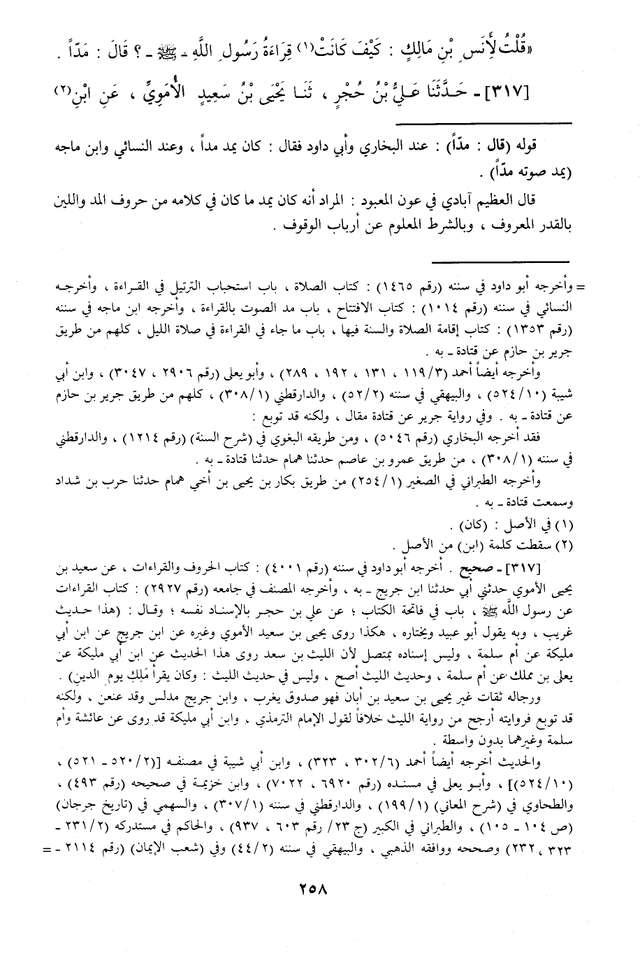 317 - حَدَّثَنَا عَلِيُّ بْنُ حُجْرٍ قَالَ: حَدَّثَنَا يَحْيَى بْنُ سَعِيدٍ الْأُمَوِيُّ، عَنِ ابْنِ -[259]- جُرَيْجٍ، عَنِ ابْنِ أَبِي مُلَيْكَةَ، عَنْ أُمِّ سَلَمَةَ، قَالَتْ: " كَانَ النَّبِيُّ صَلَّى اللهُ عَلَيْهِ وَسَلَّمَ يَقْطَعُ قِرَاءَتَهُ يَقُولُ: {§الْحَمْدُ لِلَّهِ رَبِّ الْعَالَمِينَ} [الفاتحة: 2] ثُمَّ يَقِفُ، ثُمَّ يَقُولُ: {الرَّحْمَنِ الرَّحِيمِ} [الفاتحة: 1] ثُمَّ يَقِفُ، وَكَانَ يَقْرَأُ (مَلِكِ يَوْمِ الدِّينِ)