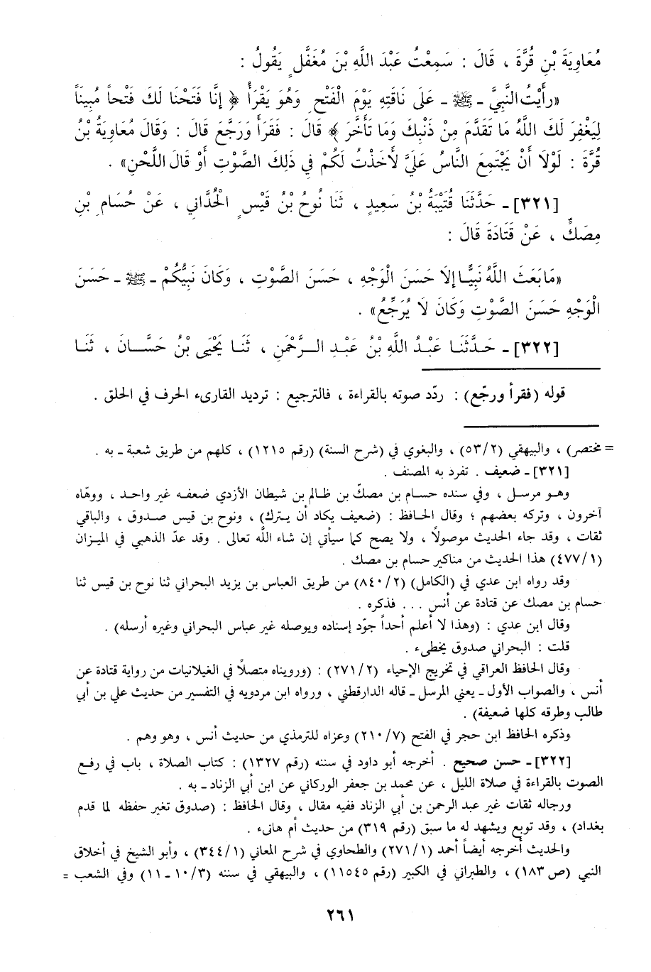 321 - حَدَّثَنَا قُتَيْبَةُ بْنُ سَعِيدٍ قَالَ: حَدَّثَنَا نُوحُ بْنُ قَيْسٍ الْحُدَّانِيُّ، عَنْ حُسَامِ بْنِ مِصَكٍّ، عَنْ قَتَادَةَ قَالَ: «§مَا بَعَثَ اللَّهُ نَبِيًّا إِلَّا حَسَنَ الْوَجْهِ، حَسَنَ الصَّوْتِ، وَكَانَ نَبِيُّكُمْ صَلَّى اللهُ عَلَيْهِ وَسَلَّمَ حَسَنَ الْوَجْهِ، حَسَنَ الصَّوْتِ، وَكَانَ لَا يُرَجِّعُ»