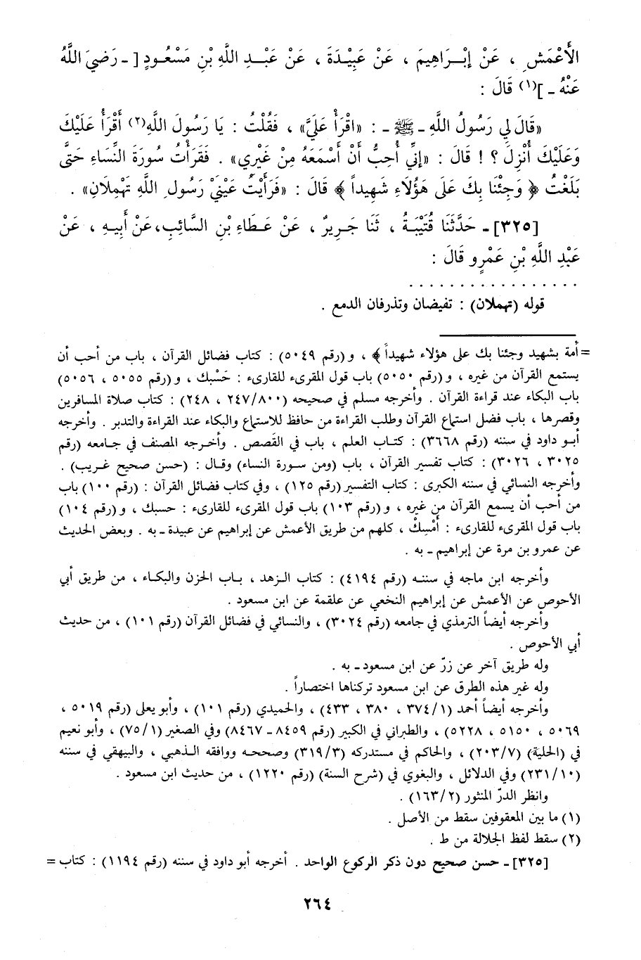 325 - حَدَّثَنَا قُتَيْبَةُ قَالَ: حَدَّثَنَا جَرِيرٌ، عَنْ عَطَاءِ بْنِ السَّائِبِ، عَنْ أَبِيهِ، عَنْ عَبْدِ اللَّهِ بْنِ عَمْرٍو قَالَ: انْكسفَتِ الشَّمْسُ يَوْمًا عَلَى عَهْدِ رَسُولِ اللَّهِ صَلَّى اللهُ عَلَيْهِ وَسَلَّمَ فَقَامَ رَسُولُ اللَّهِ صَلَّى اللهُ عَلَيْهِ وَسَلَّمَ يُصَلِّي، حَتَّى لَمْ يَكَدْ يَرْكَعُ ثُمَّ رَكَعَ، فَلَمْ يَكَدْ يَرْفَعُ رَأْسَهُ، ثُمَّ رَفَعَ رَأْسَهُ، فَلَمْ يَكَدْ أَنْ يَسْجُدَ، ثُمَّ سَجَدَ فَلَمْ يَكَدْ أَنْ يَرْفَعَ رَأْسَهُ، ثُمَّ رَفَعَ رَأْسَهُ، فَلَمْ يَكَدْ أَنْ يَسْجُدَ، ثُمَّ سَجَدَ فَلَمْ يَكَدْ أَنْ يَرْفَعَ رَأْسَهُ، فَجَعَلَ يَنْفُخُ وَيَبْكِي، وَيَقُولُ: «رَبِّ أَلَمْ تَعِدْنِي أَنْ لَا تُعَذِّبَهُمْ وَأَنَا فِيهِمْ؟ رَبِّ أَلَمْ تَعِدْنِي أَنْ لَا تُعَذِّبَهُمْ وَهُمْ يَسْتَغْفِرُونَ؟ وَنَحْنُ نَسْتَغْفِرُكَ» . فَلَمَّا صَلَّى رَكْعَتَيْنِ انْجَلَتِ الشَّمْسُ، فَقَامَ فَحَمِدَ اللَّهَ تَعَالَى وَأَثْنَى عَلَيْهِ، ثُمَّ قَالَ: «إِنَّ §الشَّمْسَ وَالْقَمَرَ آيَتَانِ مِنْ آيَاتِ اللَّهِ لَا يَنْكَسِفَانِ لِمَوْتِ أَحَدٍ وَلَا لِحَيَاتِهِ، فَإِذَا انْكَسَفَا فَافْزَعُوا إِلَى ذِكْرِ اللَّهِ تَعَالَى»