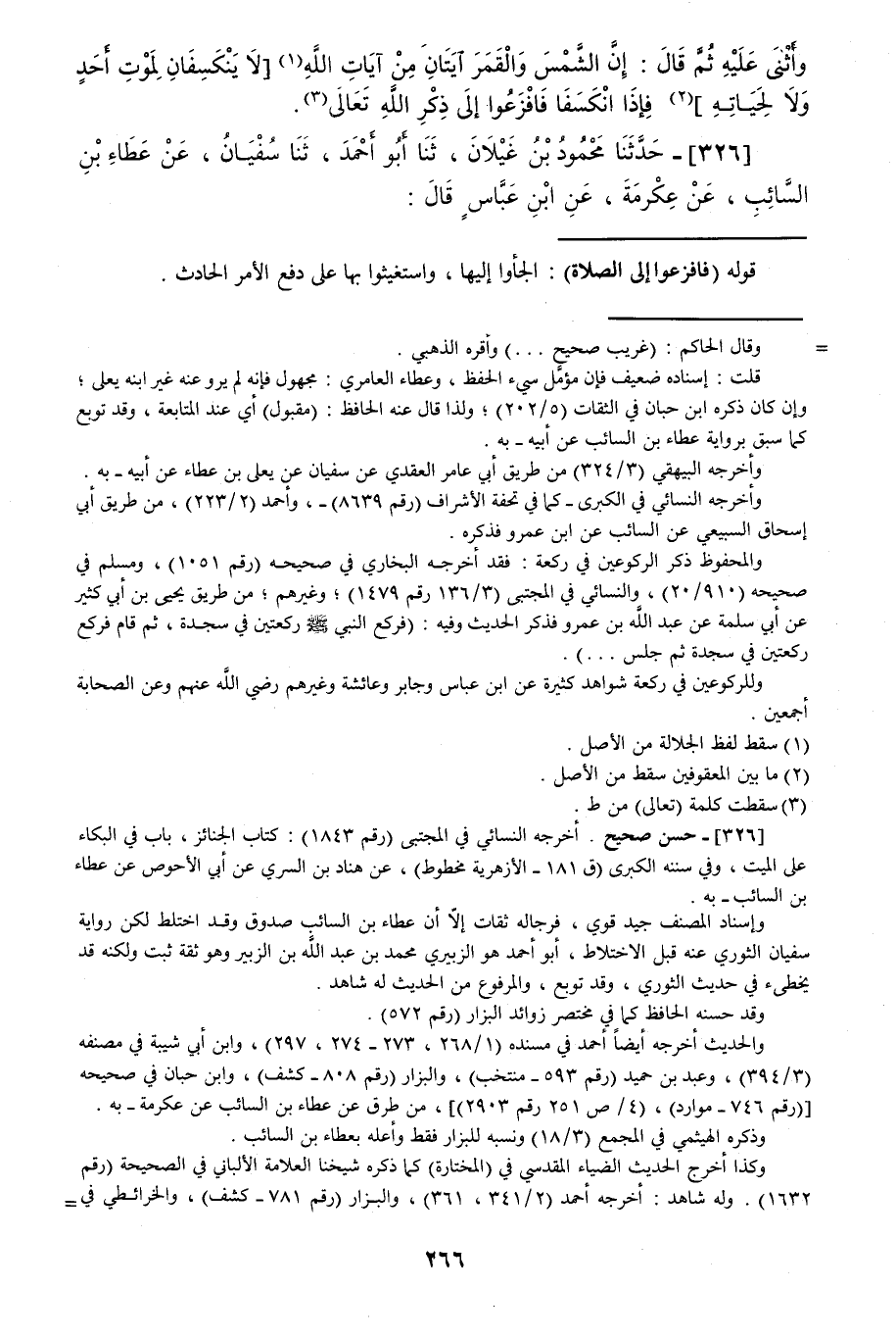 326 - حَدَّثَنَا مَحْمُودُ بْنُ غَيْلَانَ قَالَ: حَدَّثَنَا أَبُو أَحْمَدَ قَالَ: حَدَّثَنَا سُفْيَانُ، عَنْ عَطَاءِ بْنِ السَّائِبِ، عَنْ عِكْرِمَةَ، عَنِ ابْنِ عَبَّاسٍ قَالَ -[267]-: أَخَذَ رَسُولُ اللَّهِ صَلَّى اللهُ عَلَيْهِ وَسَلَّمَ ابْنَةً لَهُ تَقْضِي فَاحْتَضَنَهَا فَوَضَعَهَا بَيْنَ يَدَيْهِ فَمَاتَتْ وَهِيَ بَيْنَ يَدَيْهِ وَصَاحَتْ أُمُّ أَيْمَنَ فَقَالَ - يَعْنِي صَلَّى اللهُ عَلَيْهِ وَسَلَّمَ -: «أَتَبْكِينَ عِنْدَ رَسُولِ اللَّهِ؟» فَقَالَتْ: أَلَسْتُ أَرَاكَ تَبْكِي؟ قَالَ: «§إِنِّي لَسْتُ أَبْكِي، إِنَّمَا هِيَ رَحْمَةٌ، إِنَّ الْمُؤْمِنَ بِكُلِّ خَيْرٍ عَلَى كُلِّ حَالٍ، إِنَّ نَفْسَهُ تُنْزَعُ مِنْ بَيْنِ جَنْبَيْهِ، وَهُوَ يَحْمَدُ اللَّهَ عَزَّ وَجَلَّ»