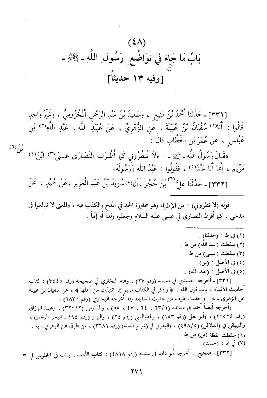 331 - حَدَّثَنَا أَحْمَدُ بْنُ مَنِيعٍ، وَسَعِيدُ بْنُ عَبْدِ الرَّحْمَنِ الْمَخْزُومِيُّ، وَغَيْرُ وَاحِدٍ قَالُوا: حَدَّثَنَا سُفْيَانُ بْنُ عُيَيْنَةَ، عَنِ الزُّهْرِيِّ، عَنْ عُبَيْدِ اللَّهِ، عَنِ ابْنِ عَبَّاسٍ، عَنْ عُمَرَ بْنِ الْخَطَّابِ قَالَ: قَالَ رَسُولُ اللَّهِ صَلَّى اللهُ عَلَيْهِ وَسَلَّمَ: " §لَا تُطْرُونِي كَمَا أَطْرَتِ النَّصَارَى ابْنَ مَرْيَمَ إِنَّمَا أَنَا عَبْدٌ فَقُولُوا: عَبْدُ اللَّهِ وَرَسُولُهُ "