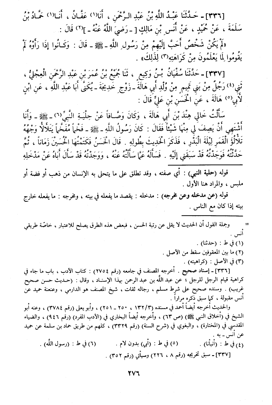 336 - حَدَّثَنَا عَبْدُ اللَّهِ بْنُ عَبْدِ الرَّحْمَنِ قَالَ: حَدَّثَنَا عَفَّانُ قَالَ: حَدَّثَنَا حَمَّادُ بْنُ سَلَمَةَ، عَنْ حُمَيْدٍ، عَنْ أَنَسِ بْنِ مَالِكٍ قَالَ: «§لَمْ يَكُنْ شَخْصٌ أَحَبَّ إِلَيْهِمْ مِنْ رَسُولِ اللَّهِ صَلَّى اللهُ عَلَيْهِ وَسَلَّمَ» قَالَ: «وَكَانُوا إِذَا رَأَوْهُ لَمْ يَقُومُوا، لِمَا يَعْلَمُونَ مِنْ كَرَاهَتِهِ لِذَلِكَ»