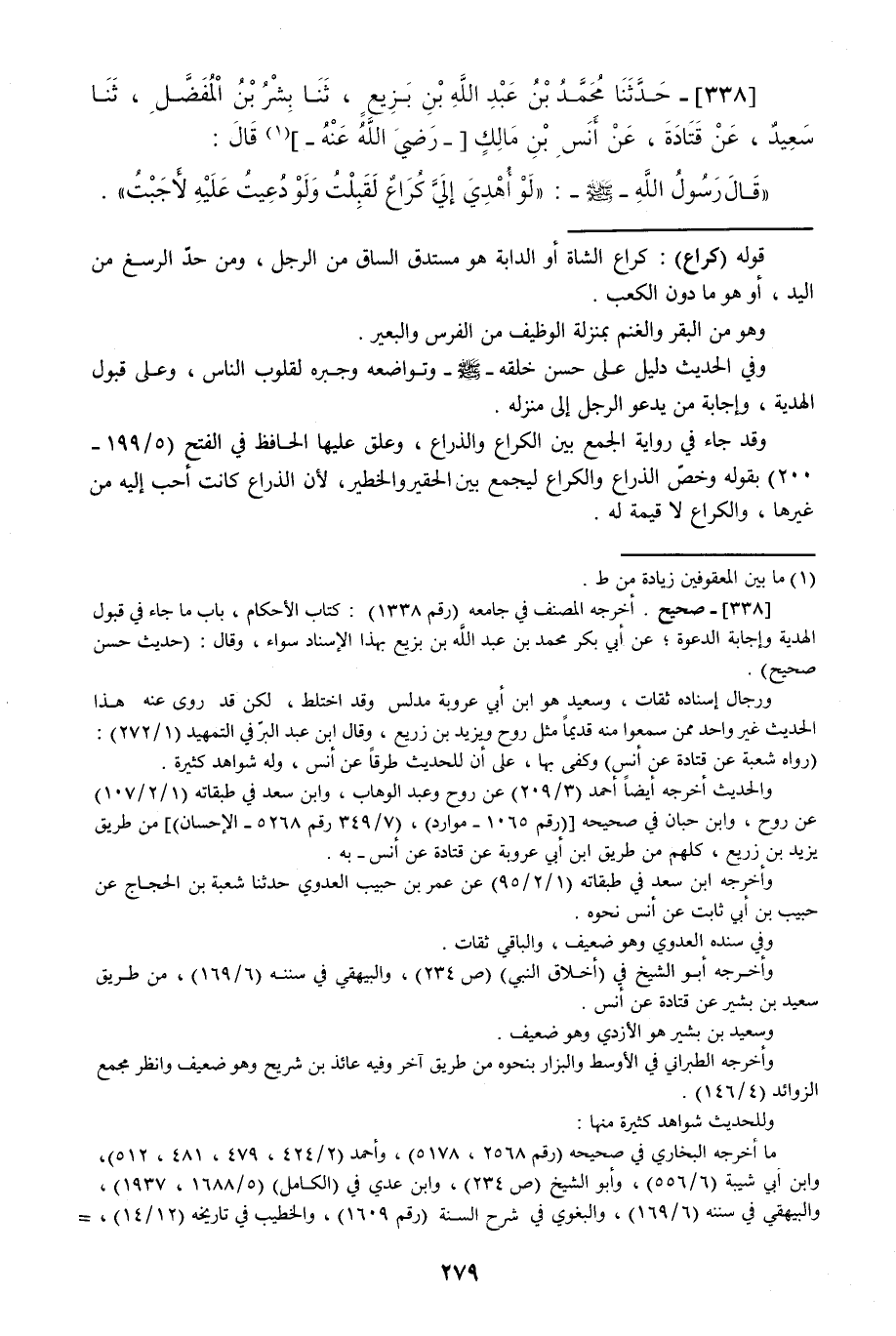 338 - حَدَّثَنَا مُحَمَّدُ بْنُ عَبْدِ اللَّهِ بْنِ بَزِيعٍ قَالَ: حَدَّثَنَا بِشْرُ بْنُ الْمُفَضَّلِ قَالَ: حَدَّثَنَا سَعِيدٌ، عَنْ قَتَادَةَ، عَنْ أَنَسِ بْنِ مَالِكٍ قَالَ: قَالَ رَسُولُ اللَّهِ صَلَّى اللهُ عَلَيْهِ وَسَلَّمَ: «§لوْ أُهْدِيَ إِلَيَّ كُرَاعٌ لَقَبِلتُ، وَلوْ دُعِيتُ عَلَيْهِ لَأَجَبْتُ»