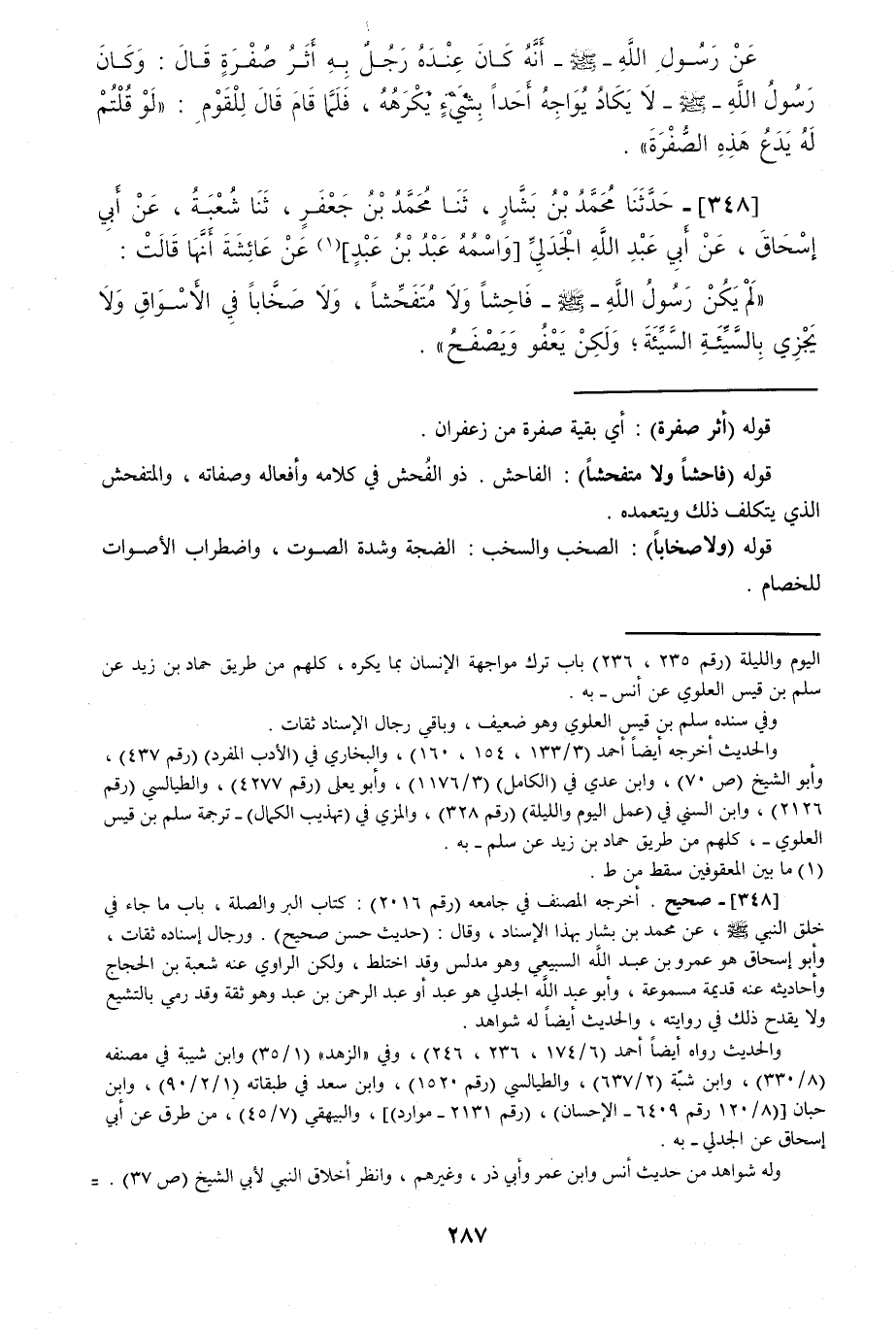 348 - حَدَّثَنَا مُحَمَّدُ بْنُ بَشَّارٍ قَالَ: حَدَّثَنَا مُحَمَّدُ بْنُ جَعْفَرٍ قَالَ: حَدَّثَنَا شُعْبَةُ، عَنْ أَبِي إِسْحَاقَ، عَنْ أَبِي عَبْدِ اللَّهِ الْجَدَلِيِّ وَاسْمُهُ عَبْدُ بْنُ عَبْدٍ، عَنْ عَائِشَةَ، أَنَّهَا قَالَتْ: «§لَمْ يَكُنْ رَسُولُ اللَّهِ صَلَّى اللهُ عَلَيْهِ وَسَلَّمَ فَاحِشًا وَلَا مُتَفَحِّشًا وَلَا صَخَّابًا فِي الْأَسْوَاقِ، وَلَا يَجْزِىءُ بِالسَّيِّئَةِ السَّيِّئَةَ، وَلَكِنْ يَعْفُو وَيَصْفَحُ»