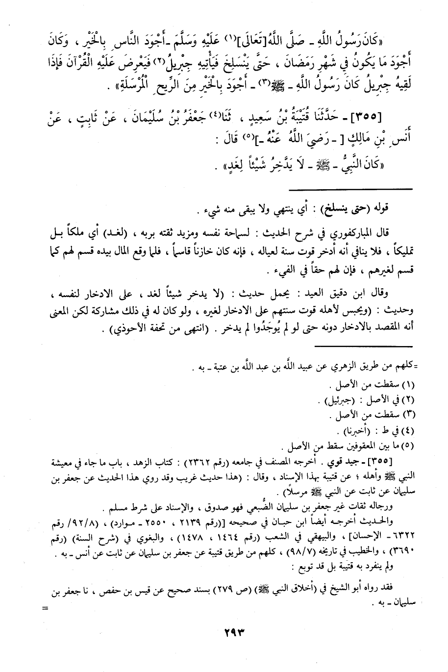 355 - حَدَّثَنَا قُتَيْبَةُ بْنُ سَعِيدٍ قَالَ: أَخْبَرَنَا جَعْفَرُ بْنُ سُلَيْمَانَ، عَنْ ثَابِتٍ، عَنْ أَنَسِ بْنِ مَالِكٍ قَالَ: «كَانَ النَّبِيُّ صَلَّى اللهُ عَلَيْهِ وَسَلَّمَ §لَا يَدَّخِرُ شَيْئًا لِغَدٍ»