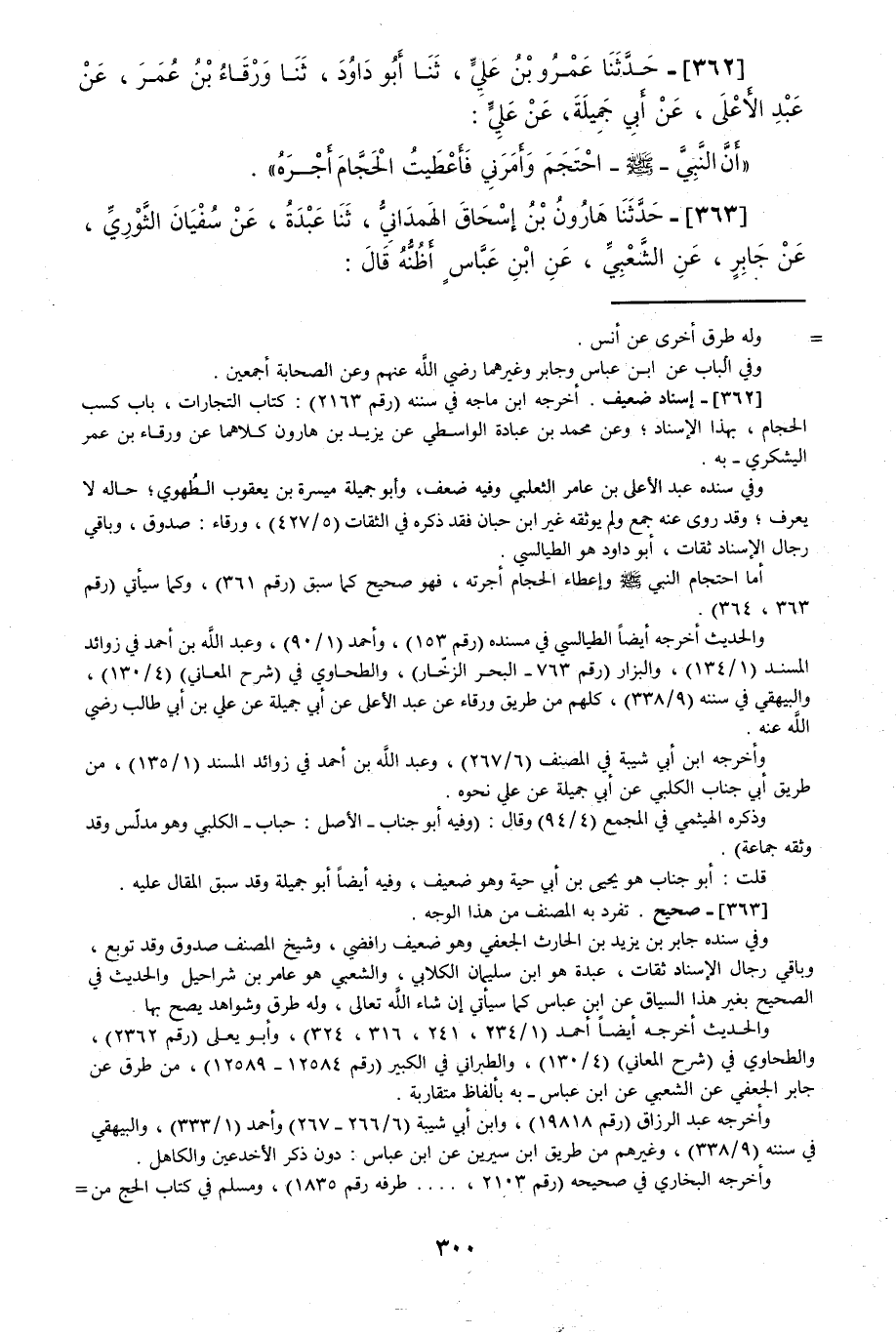 363 - حَدَّثَنَا هَارُونُ بْنُ إِسْحَاقَ الْهَمْدَانِيُّ قَالَ: حَدَّثَنَا عَبْدَةُ، عَنْ سُفْيَانَ الثَّوْرِيِّ، عَنْ جَابِرٍ، عَنِ الشَّعْبِيِّ، عَنِ ابْنِ عَبَّاسٍ قَالَ: «إِنَّ النَّبِيَّ صَلَّى اللهُ عَلَيْهِ وَسَلَّمَ §احْتَجَمَ فِي الْأَخْدَعَيْنِ وَبَيْنَ الْكَتِفَيْنِ، وَأَعْطَى الْحَجَّامَ أَجْرَهُ وَلَوْ كَانَ حَرَامًا لَمْ يُعْطِهِ»