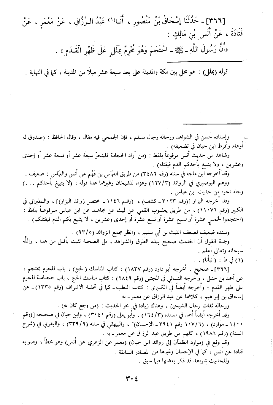 366 - حَدَّثَنَا إِسْحَاقُ بْنُ مَنْصُورٍ قَالَ: أَنْبَأَنَا عَبْدُ الرَّزَّاقِ، عَنْ مَعْمَرٍ، عَنْ قَتَادَةَ، عَنْ أَنَسِ بْنِ مَالِكٍ: «أَنَّ رَسُولَ اللَّهِ صَلَّى اللهُ عَلَيْهِ وَسَلَّمَ §احْتَجَمَ وَهُوَ مُحْرِمٌ بَمَلَلٍ عَلَى ظَهْرِ الْقَدَمِ»