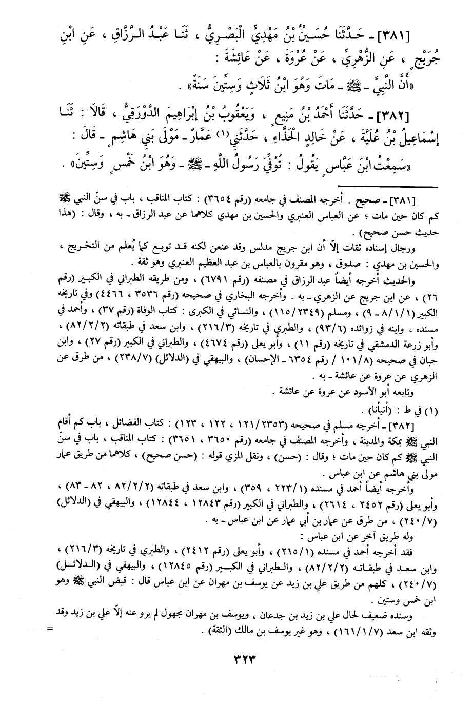 381 - حَدَّثَنَا حُسَيْنُ بْنُ مَهْدِيٍّ الْبَصْرِيُّ، قَالَ: حَدَّثَنَا عَبْدُ الرَّزَّاقِ، عَنِ ابْنِ جُرَيْجٍ، عَنِ الزُّهْرِيِّ، عَنْ عُرْوَةَ، عَنْ عَائِشَةَ: «أَنَّ النَّبِيَّ صَلَّى اللهُ عَلَيْهِ وَسَلَّمَ §مَاتَ وَهُوَ ابْنُ ثَلَاثٍ وَسِتِّينَ سَنَةً»