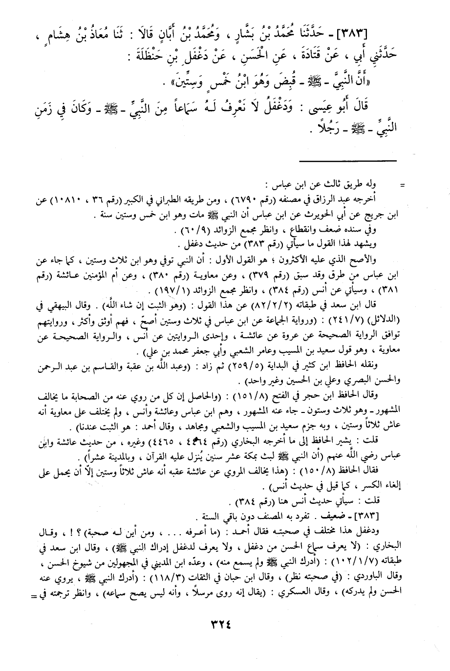 383 - حَدَّثَنَا مُحَمَّدُ بْنُ بَشَّارٍ، وَمُحَمَّدُ بْنُ أَبَانَ، قَالَا: حَدَّثَنَا مُعَاذُ بْنُ هِشَامٍ، قَالَ: حَدَّثَنِي أَبِي، عَنْ قَتَادَةَ، عَنِ الْحَسَنِ، عَنْ دَغْفَلِ بْنِ حَنْظَلَةَ: «أَنَّ النَّبِيَّ صَلَّى اللهُ عَلَيْهِ وَسَلَّمَ §قُبِضَ وَهُوَ ابْنُ خَمْسٍ وَسِتِّينَ» قَالَ أَبُو عِيسَى: وَدَغْفَلُ لَا نَعْرِفُ لَهُ سَمَاعًا مِنَ النَّبِيِّ صَلَّى اللهُ عَلَيْهِ وَسَلَّمَ وَكَانَ فِي زَمَنِ النَّبِيِّ صَلَّى اللهُ عَلَيْهِ وَسَلَّمَ رَجُلًا