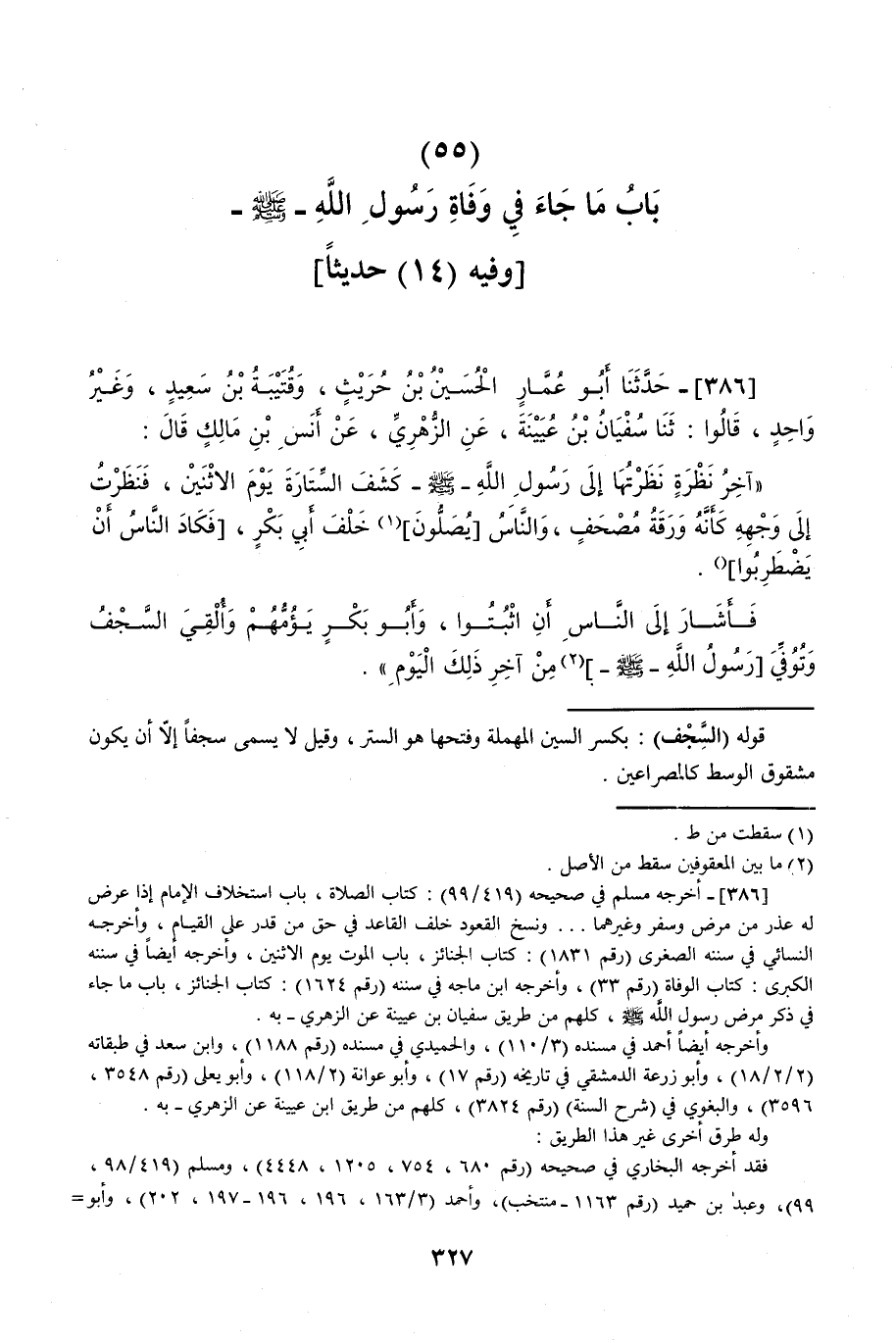 386 - حَدَّثَنَا أَبُو عَمَّارٍ الْحُسَيْنُ بْنُ حُرَيْثٍ، وَقُتَيْبَةُ بْنُ سَعِيدٍ، وَغَيْرُ وَاحِدٍ قَالُوا: حَدَّثَنَا سُفْيَانُ بْنُ عُيَيْنَةَ، عَنِ الزُّهْرِيِّ، عَنْ أَنَسِ بْنِ مَالِكٍ قَالَ: «§آخِرُ نَظْرَةٍ نَظَرْتُهَا إِلَى رَسُولِ اللَّهِ صَلَّى اللهُ عَلَيْهِ وَسَلَّمَ كَشْفُ السِّتَارَةِ يَوْمَ الْإِثْنَيْنِ، فَنَظَرْتُ إِلَى وَجْهِهِ كَأَنَّهُ وَرَقَةُ مُصْحَفٍ وَالنَّاسُ خَلْفَ أَبِي بَكْرٍ، فَأَشَارَ إِلَى النَّاسِ أَنِ اثْبُتُوا، وَأَبُو بَكْرٍ يَؤُمُّهُمْ وَأَلْقَى السِّجْفَ، وَتُوُفِّيَ رَسُولُ اللَّهِ صَلَّى اللهُ عَلَيْهِ وَسَلَّمَ مِنْ آخِرِ ذَلِكَ الْيَوْمِ»