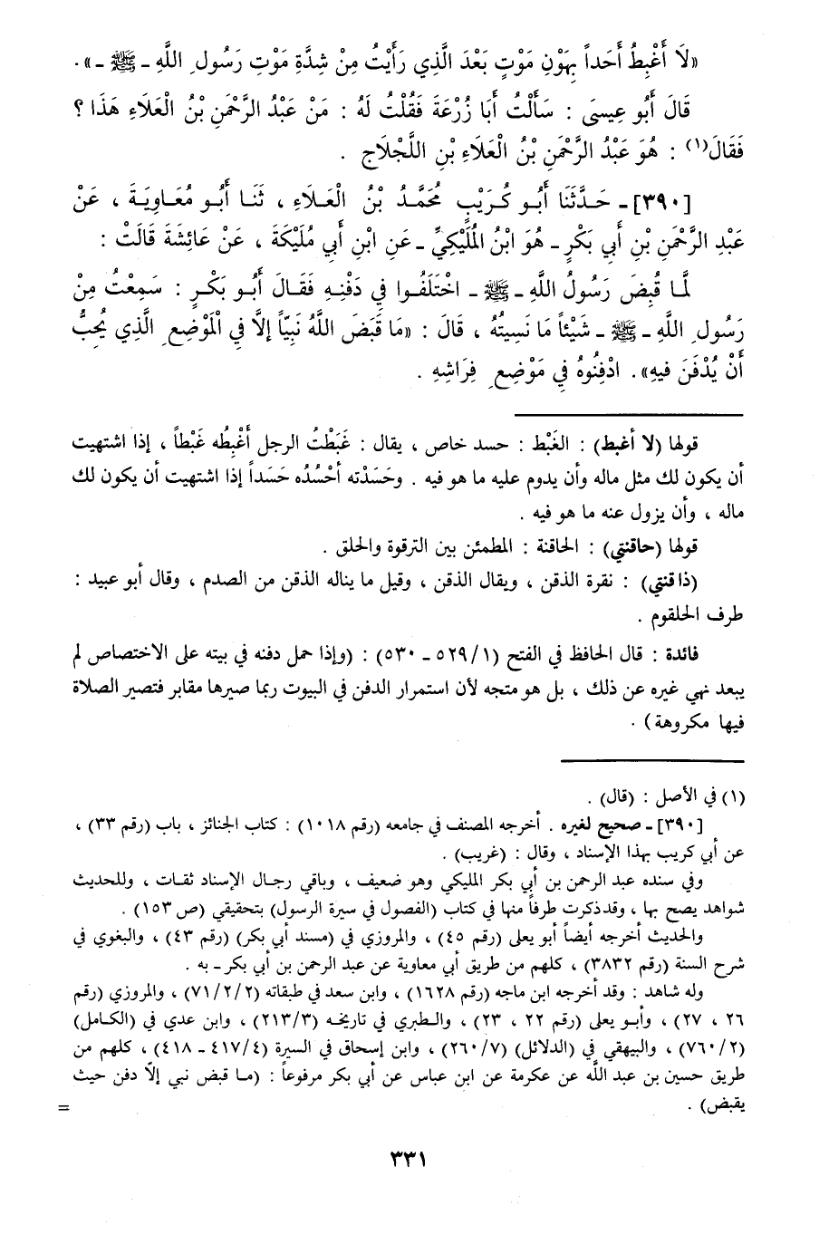 390 - حَدَّثَنَا أَبُو كُرَيْبٍ مُحَمَّدُ بْنُ الْعَلَاءِ، قَالَ: حَدَّثَنَا أَبُو مُعَاوِيَةَ، عَنْ عَبْدِ الرَّحْمَنِ بْنِ أَبِي بَكْرٍ وَهُوَ ابْنُ الْمُلَيْكِيِّ، عَنِ ابْنِ أَبِي مُلَيْكَةَ، عَنْ عَائِشَةَ، قَالَتْ: لَمَّا قُبِضَ رَسُولُ اللَّهِ صَلَّى اللهُ عَلَيْهِ وَسَلَّمَ اخْتَلَفُوا فِي دَفْنِهِ، فَقَالَ أَبُو بَكْرٍ: سَمِعْتُ مِنْ رَسُولِ اللَّهِ صَلَّى اللهُ عَلَيْهِ وَسَلَّمَ شَيْئًا مَا نَسِيتُهُ قَالَ: «§مَا قَبَضَ اللَّهُ نَبِيًّا إِلَا فِي الْمَوْضِعِ الَّذِي يُحِبُّ أَنْ يُدْفَنَ فِيهِ» . ادْفِنُوهُ فِي مَوْضِعِ فِرَاشِهِ