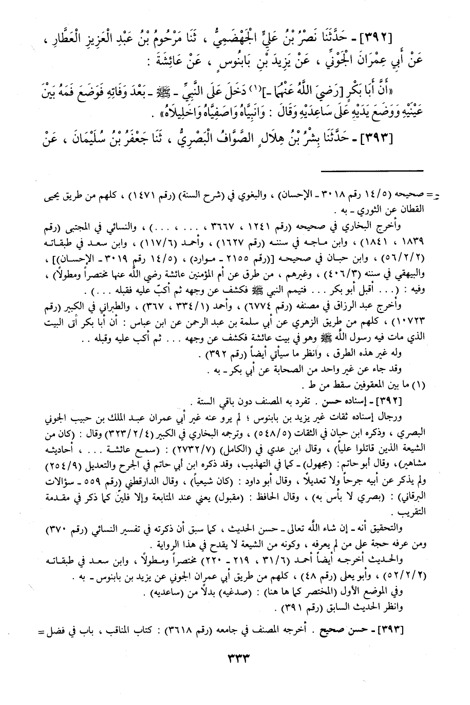392 - حَدَّثَنَا نَصْرُ بْنُ عَلِيٍّ الْجَهْضَمِيُّ، قَالَ: حَدَّثَنَا مَرْحُومُ بْنُ عَبْدِ الْعَزِيزِ الْعَطَّارُ، عَنِ أَبِي عِمْرَانَ الْجَوْنِيِّ، عَنْ يَزِيدَ بْنِ بَابَنُوسَ، عَنْ عَائِشَةَ، أَنَّ أَبَا بَكْرٍ، دَخَلَ عَلَى النَّبِيِّ صَلَّى اللهُ عَلَيْهِ وَسَلَّمَ بَعْدَ وَفَاتِهِ فَوَضَعَ فَمَهُ بَيْنَ عَيْنَيْهِ وَوَضَعَ يَدَيْهِ عَلَى سَاعِدَيْهِ، وَقَالَ: «§وَانَبِيَّاهُ، وَاصَفِيَّاهُ، وَاخَلِيلَاهُ»