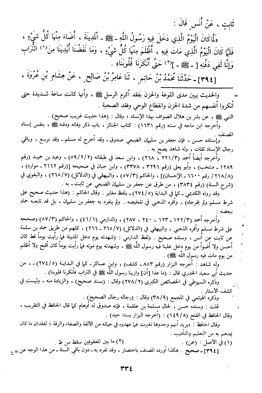 394 - حَدَّثَنَا مُحَمَّدُ بْنُ حَاتِمٍ، قَالَ: حَدَّثَنَا عَامِرُ بْنُ صَالِحٍ، عَنْ هِشَامِ بْنِ عُرْوَةَ -[335]-، عَنْ أَبِيهِ، عَنْ عَائِشَةَ، قَالَتْ: «§تُوُفِّيَ رَسُولُ اللَّهِ صَلَّى اللهُ عَلَيْهِ وَسَلَّمَ يَوْمَ الِاثْنَيْنِ»