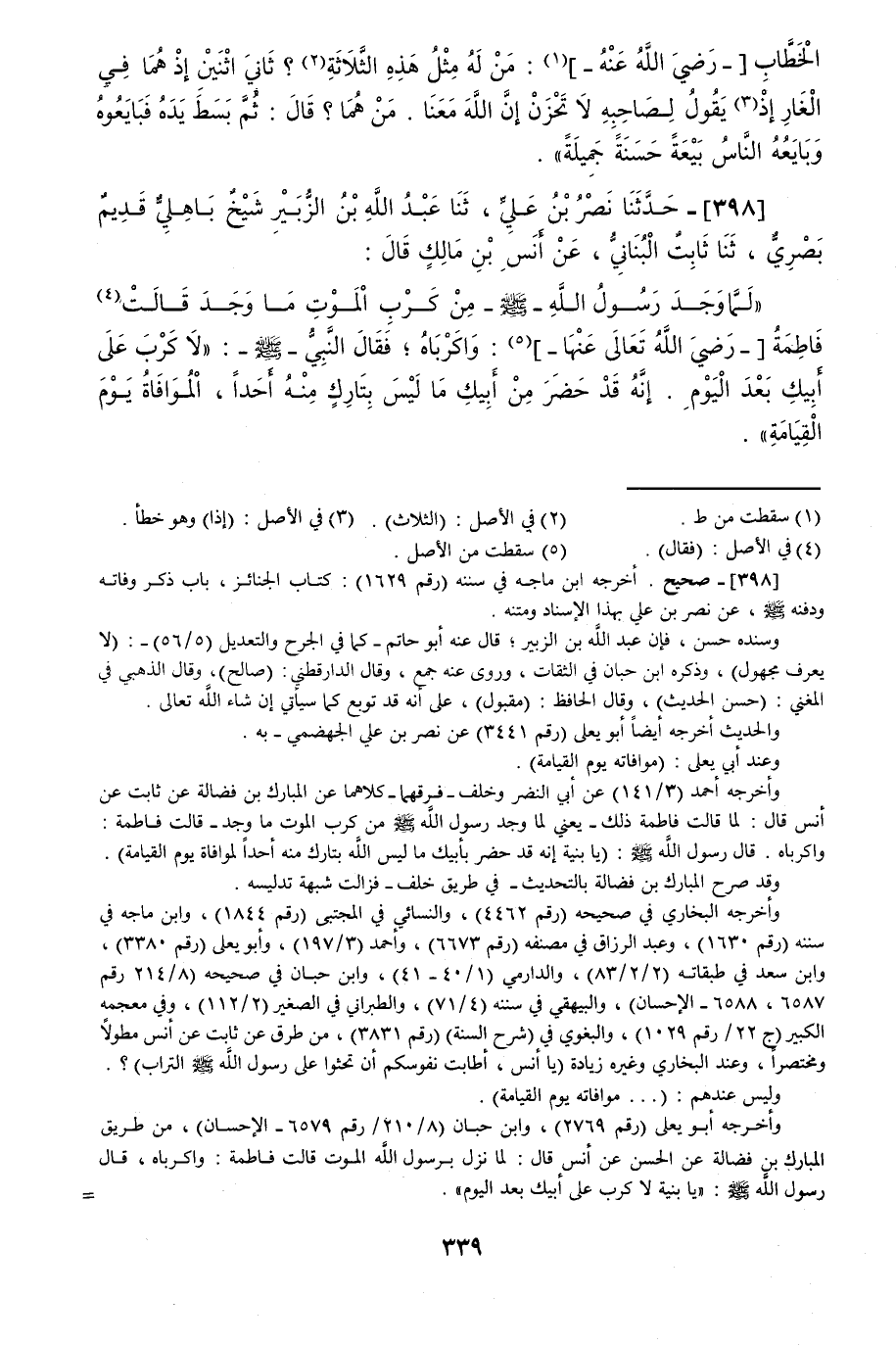 398 - حَدَّثَنَا نَصْرُ بْنُ عَلِيٍّ، قَالَ: حَدَّثَنَا عَبْدُ اللَّهِ بْنُ الزُّبَيْرِ، شَيْخٌ بَاهِلِيٌّ قَدِيمٌ بَصْرِيٌّ، قَالَ: حَدَّثَنَا ثَابِتٌ الْبُنَانِيُّ، عَنْ أَنَسِ بْنِ مَالِكٍ قَالَ: لَمَّا وَجَدَ رَسُولُ اللَّهِ صَلَّى اللهُ عَلَيْهِ وَسَلَّمَ مِنْ كُرَبِ الْمَوْتِ مَا وَجَدَ، قَالَتْ فَاطِمَةُ: وَاكَرْبَاهُ، فَقَالَ النَّبِيُّ صَلَّى اللهُ عَلَيْهِ وَسَلَّمَ: «§لَا كَرْبَ عَلَى أَبِيكِ بَعْدَ الْيَوْمِ، إِنَّهُ قَدْ حَضَرَ مِنْ أَبِيكِ مَا لَيْسَ بِتَارِكٍ مِنْهُ أَحَدًا الْمُوافَاةُ يَوْمَ الْقِيَامَةِ»