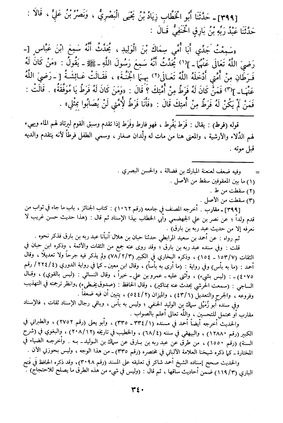399 - حَدَّثَنَا أَبُو الْخَطَّابِ زِيَادُ بْنُ يَحْيَى الْبَصْرِيُّ، وَنَصْرُ بْنُ عَلِيٍّ، قَالَا: حَدَّثَنَا عَبْدُ رَبِّهِ بْنُ بَارِقٍ الْحَنَفِيُّ قَالَ: سَمِعْتُ جَدِّي أَبَا أُمِّي سِمَاكَ بْنَ الْوَلِيدِ، يُحَدِّثُ أَنَّهُ سَمِعَ ابْنَ عَبَّاسٍ، يُحَدِّثُ أَنَّهُ سَمِعَ رَسُولَ اللَّهِ صَلَّى اللهُ عَلَيْهِ وَسَلَّمَ يَقُولُ: «§مَنْ كَانَ لَهُ فَرَطَانِ مِنْ أُمَّتِي أَدْخَلَهُ اللَّهُ تَعَالَى بِهِمَا الْجَنَّةَ» ، فَقَالَتْ عَائِشَةُ: فَمَنْ كَانَ لَهُ فَرَطٌ مِنْ أُمَّتِكَ؟ قَالَ: «وَمَنْ كَانَ لَهُ فَرَطٌ يَا مُوَفَّقَةُ» قَالَتْ: فَمَنْ لَمْ يَكُنْ لَهُ فَرَطٌ مِنْ أُمَّتِكَ؟ قَالَ: «فَأَنَا فَرَطٌ لِأُمَّتِي، لَنْ يُصَابُوا بِمِثْلِي»