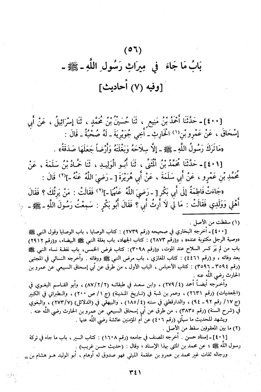 401 - حَدَّثَنَا مُحَمَّدُ بْنُ الْمُثَنَّى قَالَ: حَدَّثَنَا أَبُو الْوَلِيدِ، قَالَ: حَدَّثَنَا حَمَّادُ بْنُ سَلَمَةَ، عَنْ مُحَمَّدِ بْنِ عَمْرٍو، عَنْ أَبِي سَلَمَةَ، عَنْ أَبِي هُرَيْرَةَ قَالَ: جَاءَتْ فَاطِمَةُ إِلَى أَبِي بَكْرٍ فَقَالَتْ: مَنْ يَرِثُكَ؟ فَقَالَ: أَهْلِي وَوَلَدِي، فَقَالَتْ: مَا لِي لَا أَرِثُ أَبِي؟ فَقَالَ أَبُو بَكْرٍ: سَمِعْتُ رَسُولَ اللَّهِ صَلَّى اللهُ عَلَيْهِ وَسَلَّمَ -[342]- يَقُولُ: «§لَا نُورَثُ» ، وَلَكِنِّي أَعُولُ مَنْ كَانَ رَسُولُ اللَّهِ صَلَّى اللهُ عَلَيْهِ وَسَلَّمَ يَعُولُهُ، وَأُنْفِقُ عَلَى مَنْ كَانَ رَسُولُ اللَّهِ صَلَّى اللهُ عَلَيْهِ وَسَلَّمَ يُنْفِقُ عَلَيْهِ