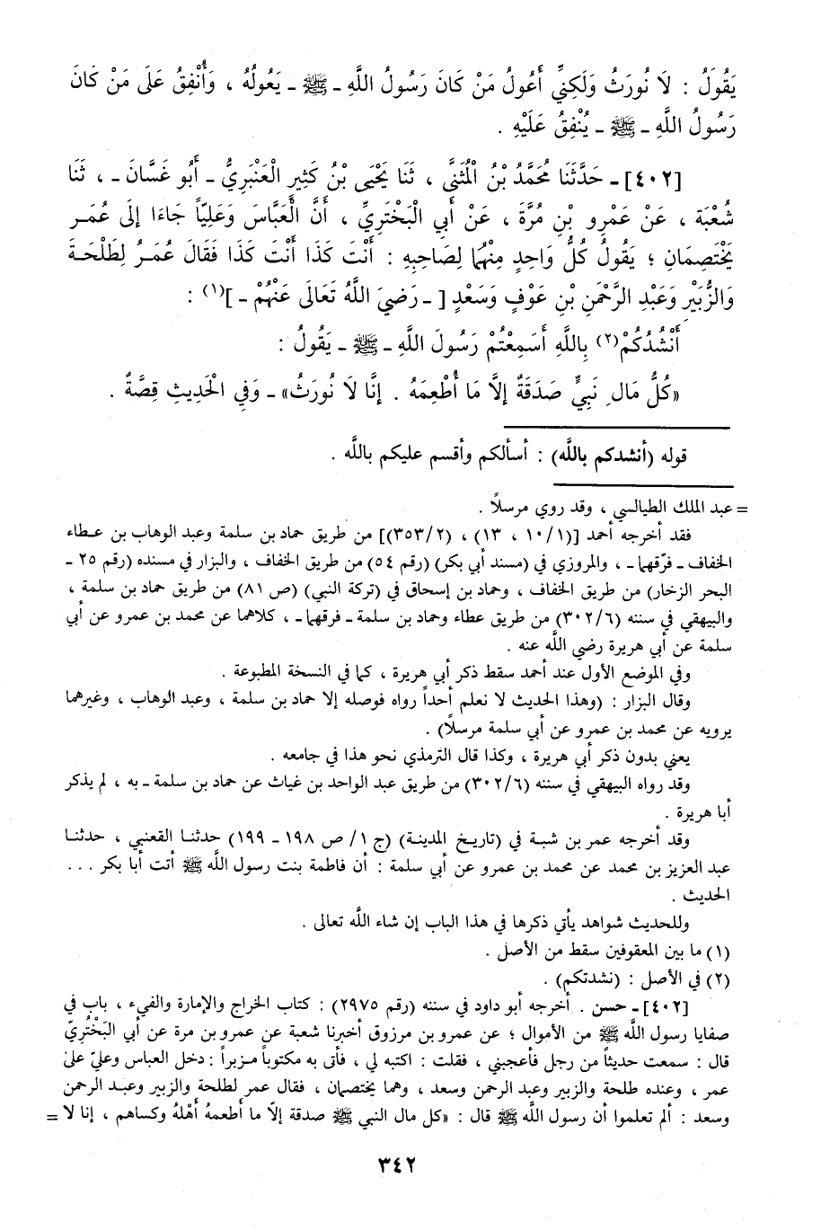 402 - حَدَّثَنَا مُحَمَّدُ بْنُ الْمُثَنَّى قَالَ: حَدَّثَنَا يَحْيَى بْنُ كَثِيرٍ الْعَنْبَرِيُّ أَبُو غَسَّانَ، قَالَ: حَدَّثَنَا شُعْبَةُ، عَنْ عَمْرِو بْنِ مُرَّةَ، عَنْ أَبِي الْبَخْتَرِيِّ، أَنَّ الْعَبَّاسَ، وَعَلِيًّا، جَاءَا إِلَى عُمَرَ يَخْتَصِمَانِ يَقُولُ كُلُّ وَاحِدٍ مِنْهُمَا لِصَاحِبِهِ: أَنْتَ كَذَا، أَنْتَ كَذَا، فَقَالَ عُمَرُ، لِطَلْحَةَ، وَالزُّبَيْرِ، وَعَبْدِ الرَّحْمَنِ بْنِ عَوْفٍ، وَسَعْدٍ: أَنْشُدُكُمْ بِاللَّهِ أَسَمِعْتُمْ رَسُولَ اللَّهِ صَلَّى اللهُ عَلَيْهِ وَسَلَّمَ يَقُولُ: «§كُلُّ مَالِ نَبِيٍّ صَدَقَةٌ، إِلَّا مَا أَطْعَمَهُ، إِنَّا لَا نُورَثُ؟» وَفِي الْحَدِيثِ قِصَّةٌ