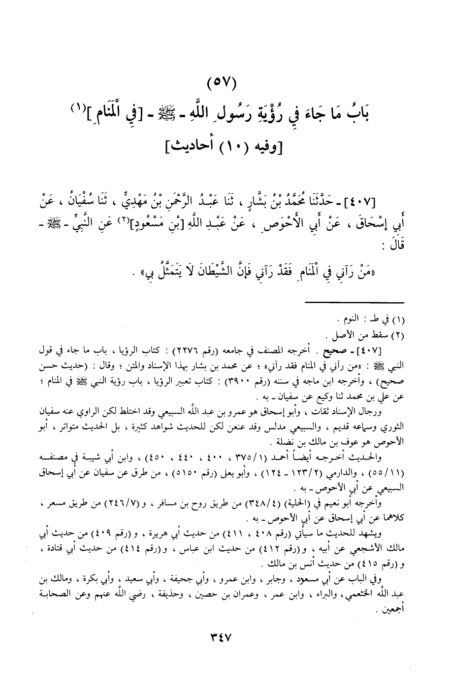 407 - حَدَّثَنَا مُحَمَّدُ بْنُ بَشَّارٍ قَالَ: حَدَّثَنَا عَبْدُ الرَّحْمَنِ بْنُ مَهْدِيٍّ قَالَ: حَدَّثَنَا سُفْيَانُ، عَنْ أَبِي إِسْحَاقَ، عَنْ أَبِي الْأَحْوَصِ، عَنْ عَبْدِ اللَّهِ بْنِ مَسْعُودٍ، عَنِ النَّبِيِّ صَلَّى اللهُ عَلَيْهِ وَسَلَّمَ قَالَ: «§مَنْ رَآنِي فِي الْمَنَامِ فَقَدْ رَآنِي فَإِنَّ الشَّيْطَانَ لَا يَتَمَثَّلُ بِي»