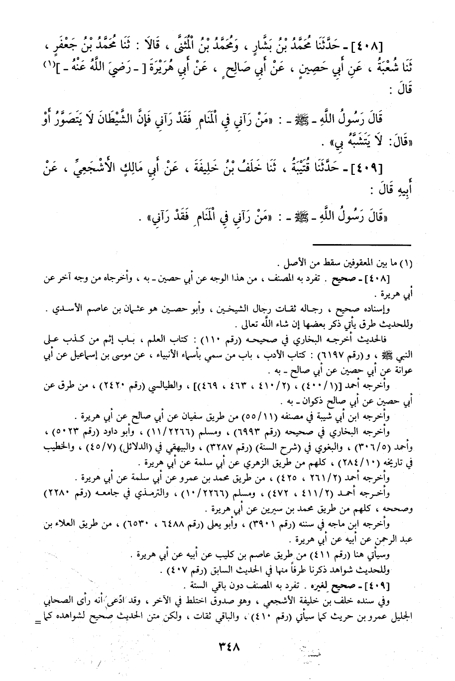 408 - حَدَّثَنَا مُحَمَّدُ بْنُ بَشَّارٍ، وَمُحَمَّدُ بْنُ الْمُثَنَّى، قَالَا: حَدَّثَنَا مُحَمَّدُ بْنُ جَعْفَرٍ، قَالَ: حَدَّثَنَا شُعْبَةُ، عَنْ أَبِي حُصَينٍ، عَنْ أَبِي صَالِحٍ، عَنْ أَبِي هُرَيْرَةَ قَالَ: قَالَ رَسُولُ اللَّهِ صَلَّى اللهُ عَلَيْهِ وَسَلَّمَ: «§مَنْ رَآنِي فِي الْمَنَامِ فَقَدْ رَآنِي فَإِنَّ الشَّيْطَانَ لَا يَتَصَوَّرُ» أَوْ قَالَ: «لَا يَتَشَبَّهُ بِي»