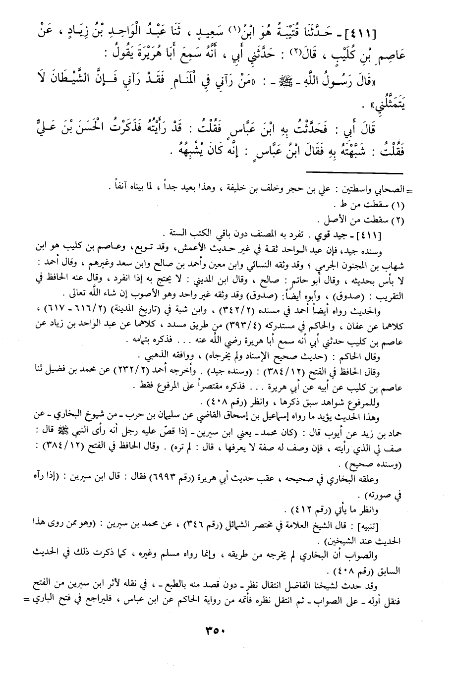 حَدَّثَنَا قُتَيْبَةُ هُوَ ابْنُ سَعِيدٍ، قَالَ: حَدَّثَنَا عَبْدُ الْوَاحِدِ بْنُ زِيَادٍ، عَنْ عَاصِمِ بْنِ كُلَيْبٍ قَالَ: حَدَّثَنِي أَبِي، أَنَّهُ سَمِعَ أَبَا هُرَيْرَةَ يَقُولُ: قَالَ رَسُولُ اللَّهِ صَلَّى اللهُ عَلَيْهِ وَسَلَّمَ: «§مَنْ رَآنِي فِي الْمَنَامِ فَقَدْ رَآنِي فَإِنَّ الشَّيْطَانَ لَا يَتَمَثَّلُنِي» قَالَ أَبِي: فَحَدَّثْتُ بِهِ ابْنَ عَبَّاسٍ، فَقُلْتُ: قَدْ رَأَيْتُهُ، فَذَكَرْتُ الْحَسَنَ بْنَ عَلِيٍّ فَقُلْتُ: شَبَّهْتُهُ بِهِ، فَقَالَ ابْنُ عَبَّاسٍ: «إِنَّهُ كَانَ يُشْبِهُهُ»
