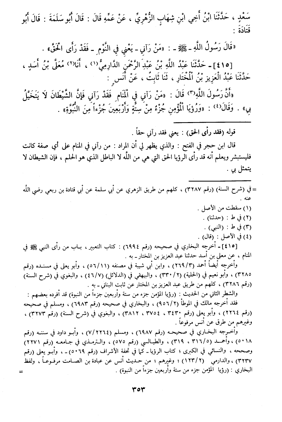 415 - حَدَّثَنَا عَبْدُ اللَّهِ بْنُ عَبْدِ الرَّحْمَنِ الدَّارِمِيُّ قَالَ: حَدَّثَنَا مُعَلَّى بْنُ أَسَدٍ، قَالَ: حَدَّثَنَا عَبْدُ الْعَزِيزِ بْنُ الْمُخْتَارِ، قَالَ: حَدَّثَنَا ثَابِتٌ، عَنْ أَنَسٍ: أَنَّ رَسُولَ اللَّهِ صَلَّى اللهُ عَلَيْهِ وَسَلَّمَ قَالَ: «§مَنْ رَآنِي فِي الْمَنَامِ فَقَدْ رَآنِي، فَإِنَّ الشَّيْطَانَ لَا يَتَخَيَّلُ بِي» وَقَالَ: «وَرُؤْيَا الْمُؤْمِنِ جُزْءٌ مِنْ سِتَّةٍ وَأَرْبَعِينَ جُزْءًا مِنَ النُّبُوَّةِ»