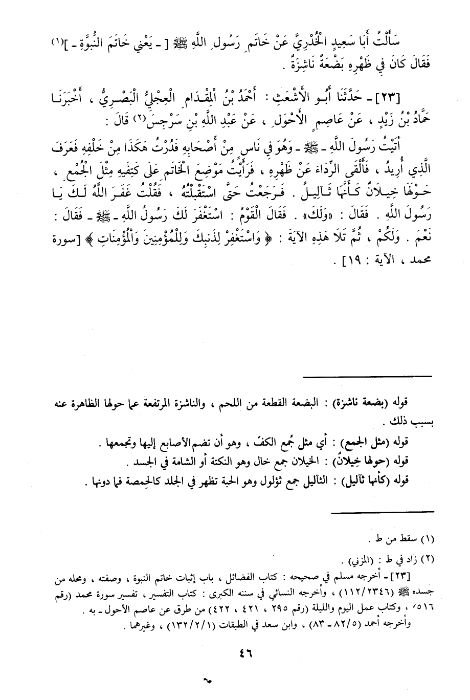 23 - حَدَّثَنَا أَحْمَدُ بْنُ الْمِقْدَامِ أَبُو الْأَشْعَثِ الْعِجْلِيُّ الْبَصْرِيُّ قَالَ: أَخْبَرَنَا حَمَّادُ بْنُ زَيْدٍ، عَنْ عَاصِمٍ الْأَحْوَلِ، عَنْ عَبْدِ اللَّهِ بْنِ سَرْجِسَ قَالَ: أَتَيْتُ رَسُولَ اللَّهِ صَلَّى اللهُ عَلَيْهِ وَسَلَّمَ وَهُوَ فِي نَاسٍ مِنْ أَصْحَابِهِ، فَدُرْتُ هَكَذَا مِنْ خَلْفِهِ، فَعَرَفَ الَّذِي أُرِيدُ، §فَأَلْقَى الرِّدَاءَ عَنْ ظَهْرِهِ، فَرَأَيْتُ مَوْضِعَ الْخَاتَمِ عَلَى كَتِفَيْهِ مِثْلَ الْجُمْعِ حَوْلَهَا خِيلَانٌ كَأَنَّهَا ثَآلِيلُ، فَرَجَعْتُ حَتَّى اسْتَقْبَلْتُهُ، فَقُلْتُ: غَفَرَ اللَّهُ لَكَ يَا رَسُولَ اللَّهِ، فَقَالَ: «وَلَكَ» فَقَالَ الْقَوْمُ: أَسْتَغْفَرَ لَكَ رَسُولُ اللَّهِ صَلَّى اللهُ عَلَيْهِ وَسَلَّمَ؟ فَقَالَ: نَعَمْ، وَلَكُمْ، ثُمَّ تَلَا هَذِهِ الْآيَةَ {وَاسْتَغْفِرْ لِذَنْبِكَ وَلِلْمُؤْمِنِينَ وَالْمُؤْمِنَاتِ} [محمد: 19]