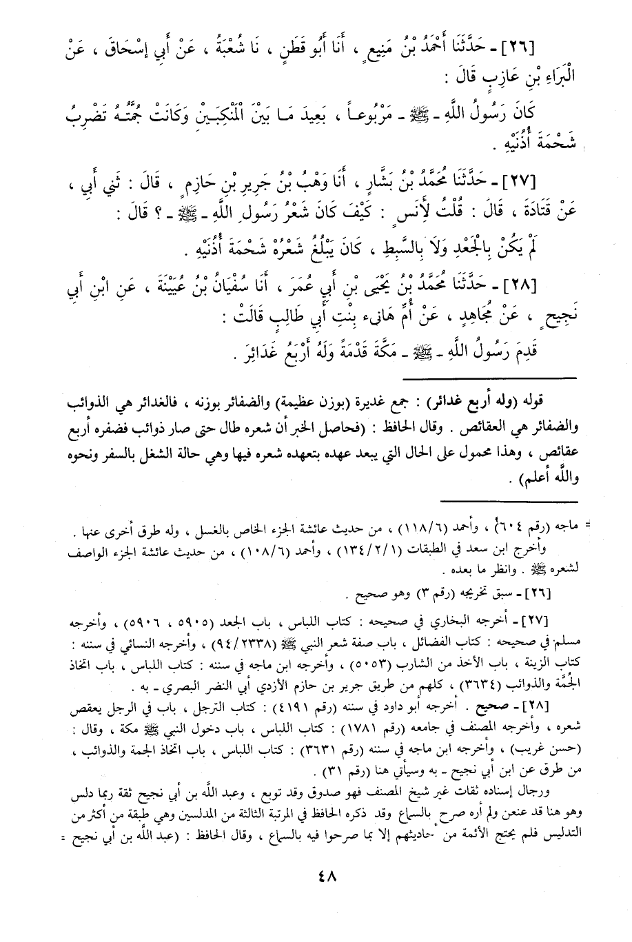 26 - حَدَّثَنَا أَحْمَدُ بْنُ مَنِيعٍ قَالَ: حَدَّثَنَا أَبُو قَطَنٍ قَالَ: حَدَّثَنَا شُعْبَةُ، عَنْ أَبِي إِسْحَاقَ، عَنِ الْبَرَاءِ بْنِ عَازِبٍ قَالَ: «كَانَ §رَسُولُ اللَّهِ صَلَّى اللهُ عَلَيْهِ وَسَلَّمَ مَرْبُوعًا، بَعِيدَ مَا بَيْنَ الْمِنْكَبَيْنِ، وَكَانَتْ جُمَّتُهُ تَضْرِبُ شَحْمَةَ أُذُنَيْهِ»