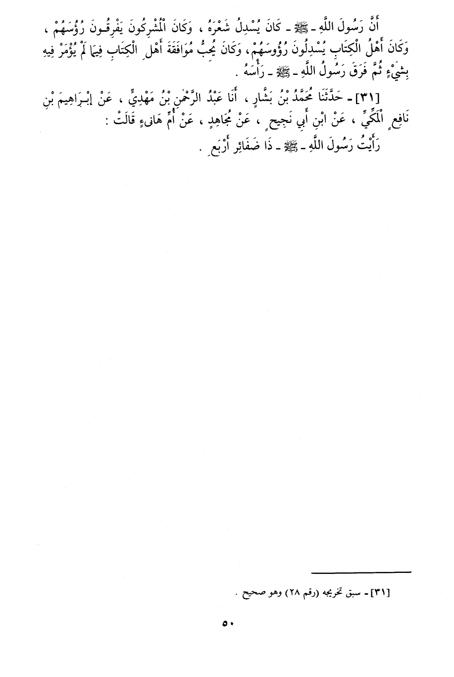 31 - حَدَّثَنَا مُحَمَّدُ بْنُ بَشَّارٍ قَالَ: حَدَّثَنَا عَبْدُ الرَّحْمَنِ بْنُ مَهْدِيٍّ، عَنْ إِبْرَاهِيمَ بْنِ نَافِعٍ الْمَكِّيِّ، عَنِ ابْنِ أَبِي نَجِيحٍ، عَنْ مُجَاهِدٍ، عَنْ أُمِّ هَانِئٍ، قَالَتْ: «§رَأَيْتُ رَسُولَ اللَّهِ صَلَّى اللهُ عَلَيْهِ وَسَلَّمَ ذَا ضَفَائِرَ أَرْبَعٍ»