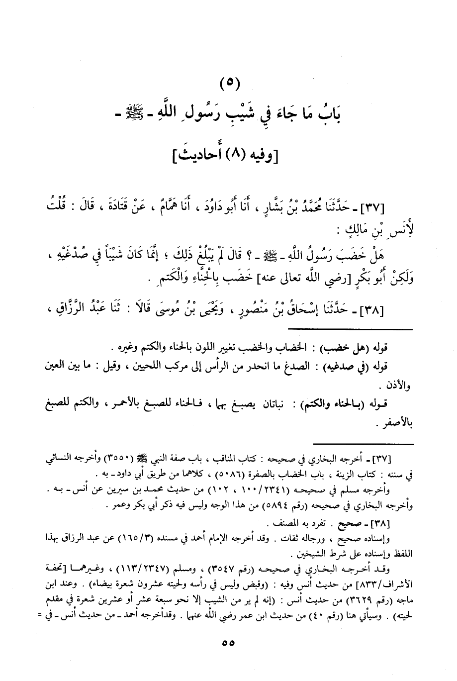 37 - حَدَّثَنَا مُحَمَّدُ بْنُ بَشَّارٍ قَالَ: أَخْبَرَنَا أَبُو دَاوُدَ قَالَ: أَخْبَرَنَا هَمَّامٌ، عَنْ قَتَادَةَ قَالَ: قُلْتُ لِأَنَسِ بْنِ مَالِكٍ: §هَلْ خَضَبَ رَسُولُ اللَّهِ صَلَّى اللهُ عَلَيْهِ وَسَلَّمَ؟ قَالَ: «لَمْ يَبْلُغْ ذَلِكَ، إِنَّمَا كَانَ شَيْبًا فِي صُدْغَيْهِ» وَلَكِنْ أَبُو بَكْرٍ، خَضَبَ بِالْحِنَّاءِ وَالْكَتَمِ "