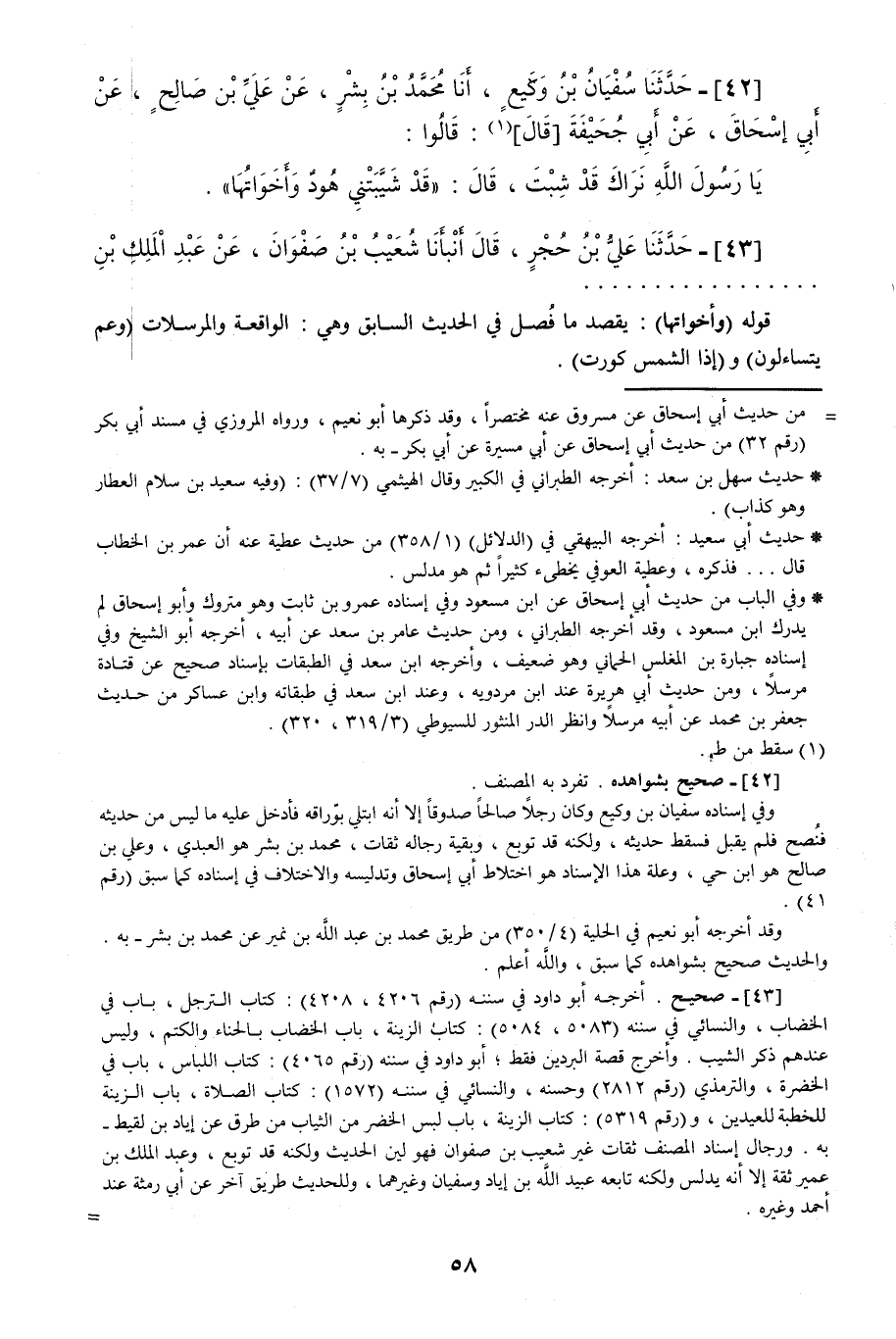 42 - حَدَّثَنَا سُفْيَانُ بْنُ وَكِيعٍ قَالَ: حَدَّثَنَا مُحَمَّدُ بْنُ بِشْرٍ، عَنْ عَلِيِّ بْنِ صَالِحٍ، عَنْ أَبِي إِسْحَاقَ، عَنْ أَبِي جُحَيْفَةَ قَالَ: قَالُوا: يَا رَسُولَ اللَّهِ، نَرَاكَ قَدْ شِبْتَ، قَالَ: «قَدْ §شَيَّبَتْنِي هُودٌ وَأَخَوَاتُهَا»