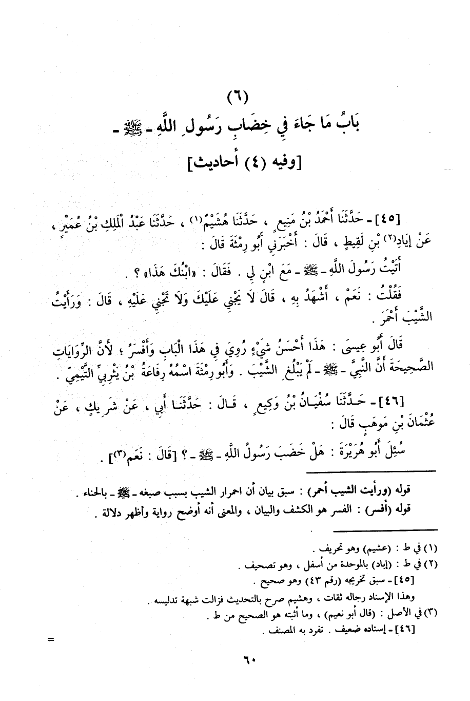 46 - حَدَّثَنَا سُفْيَانُ بْنُ وَكِيعٍ قَالَ: حَدَّثَنَا أَبِي، عَنْ شَرِيكٍ، عَنْ عُثْمَانَ بْنِ مَوْهَبٍ قَالَ: سُئِلَ أَبُو هُرَيْرَةَ: §هَلْ خَضَبَ رَسُولُ اللَّهِ صَلَّى اللهُ عَلَيْهِ وَسَلَّمَ؟ قَالَ: «نَعَمْ» -[61]- قَالَ أَبُو عِيسَى: " وَرَوَى أَبُو عَوَانَةَ هَذَا الْحَدِيثَ عَنْ عُثْمَانَ بْنِ عَبْدِ اللَّهِ بْنِ مَوْهَبٍ، فَقَالَ: عَنْ أُمِّ سَلَمَةَ "