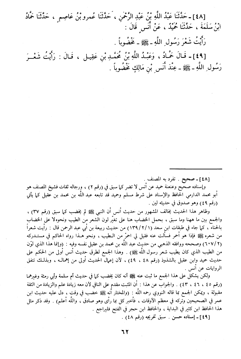 48 - حَدَّثَنَا عَبْدُ اللَّهِ بْنُ عَبْدِ الرَّحْمَنِ قَالَ: حَدَّثَنَا عَمْرُو بْنُ عَاصِمٍ قَالَ: حَدَّثَنَا حَمَّادُ بْنُ سَلَمَةَ قَالَ: حَدَّثَنَا حُمَيْدٌ، عَنْ أَنَسٍ قَالَ: «§رَأَيْتُ شَعْرَ رَسُولِ اللَّهِ صَلَّى اللهُ عَلَيْهِ وَسَلَّمَ مَخْضُوبًا»