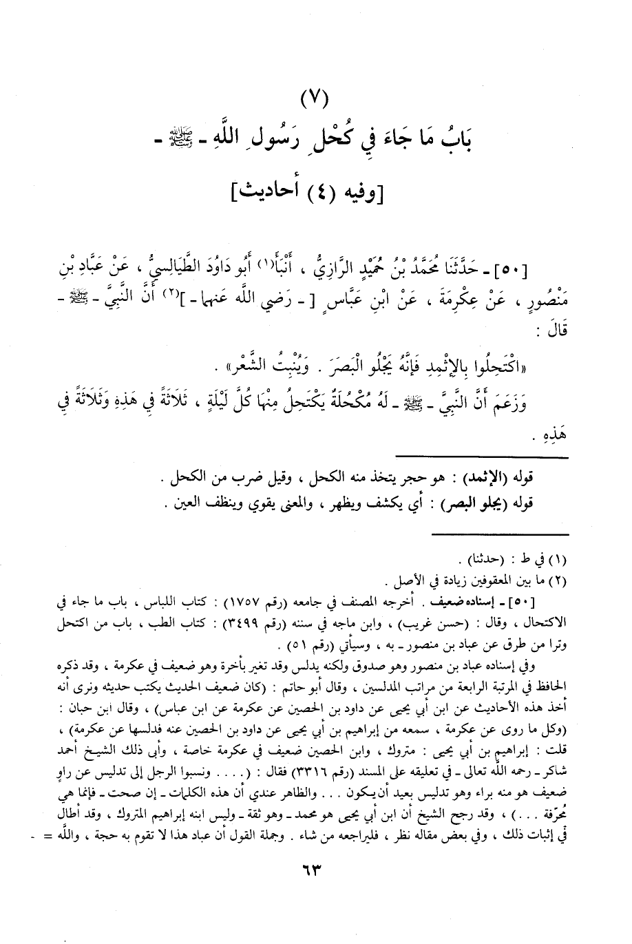 50 - حَدَّثَنَا مُحَمَّدُ بْنُ حُمَيْدٍ الرَّازِيُّ قَالَ: حَدَّثَنَا أَبُو دَاوُدَ الطَّيَالِسِيُّ، عَنْ عَبَّادِ بْنِ مَنْصُورٍ، عَنْ عِكْرِمَةَ، عَنِ ابْنِ عَبَّاسٍ، أَنَّ النَّبِيَّ صَلَّى اللهُ عَلَيْهِ وَسَلَّمَ قَالَ: «§اكْتَحِلُوا بِالْإِثْمِدِ فَإِنَّهُ يَجْلُو الْبَصَرَ، وَيُنْبِتُ الشَّعْرَ»