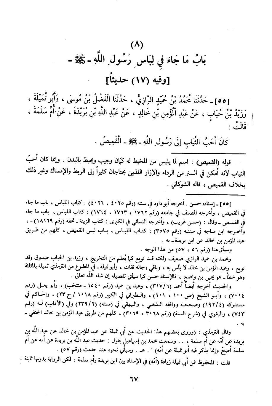 55 - حَدَّثَنَا مُحَمَّدُ بْنُ حُمَيْدٍ الرَّازِيُّ قَالَ: حَدَّثَنَا الْفَضْلُ بْنُ مُوسَى، وَأَبُو تُمَيْلَةَ، وَزَيْدُ بْنُ حُبَابٍ، عَنْ عَبْدِ الْمُؤْمِنِ بْنِ خَالِدٍ، عَنْ عَبْدِ اللَّهِ بْنِ بُرَيْدَةَ، عَنْ أُمِّ سَلَمَةَ، قَالَتْ: «§كَانَ أَحَبَّ الثِّيَابِ إِلَى رَسُولِ اللَّهِ صَلَّى اللهُ عَلَيْهِ وَسَلَّمَ الْقَمِيصُ»