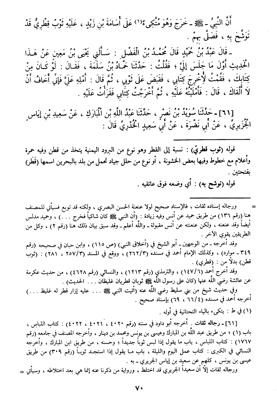 61 - حَدَّثَنَا سُوَيْدُ بْنُ نَصْرٍ قَالَ: حَدَّثَنَا عَبْدُ اللَّهِ بْنُ الْمُبَارَكِ، عَنْ سَعِيدِ بْنِ إِيَاسٍ الْجُرَيْرِيِّ، عَنْ أَبِي نَضْرَةَ، عَنْ أَبِي سَعِيدٍ الْخُدْرِيِّ قَالَ -[71]-: كَانَ رَسُولُ اللَّهِ صَلَّى اللهُ عَلَيْهِ وَسَلَّمَ إِذَا اسْتَجَدَّ ثَوْبًا سَمَّاهُ بِاسْمِهِ عِمَامَةً أَوْ قَمِيصًا أَوْ رِدَاءً، ثُمَّ يَقُولُ: «§اللَّهُمَّ لَكَ الْحَمْدُ كَمَا كَسَوْتَنِيهِ، أَسْأَلُكَ خَيْرَهُ وَخَيْرَ مَا صُنِعَ لَهُ، وَأَعُوذُ بِكَ مِنْ شَرِّهِ وَشَرِّ مَا صُنِعَ لَهُ» .