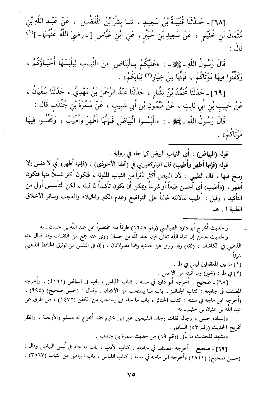 68 - حَدَّثَنَا قُتَيْبَةُ بْنُ سَعِيدٍ قَالَ: حَدَّثَنَا بِشْرُ بْنُ الْمُفَضَّلِ، عَنْ عَبْدِ اللَّهِ بْنِ عُثْمَانَ بْنِ خُثَيْمٍ، عَنْ سَعِيدِ بْنِ جُبَيْرٍ، عَنِ ابْنِ عَبَّاسٍ قَالَ: قَالَ رَسُولُ اللَّهِ صَلَّى اللهُ عَلَيْهِ وَسَلَّمَ: «§عَلَيْكُمْ بِالْبَيَاضِ مِنَ الثِّيَابِ لِيَلْبِسْهَا أَحْيَاؤُكُمْ، وَكَفِّنُوا فِيهَا مَوْتَاكُمْ، فَإِنَّهَا مِنْ خَيْرِ ثِيَابِكُمْ»
