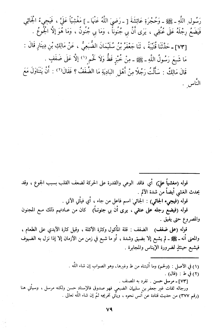 73 - حَدَّثَنَا قُتَيْبَةُ قَالَ: حَدَّثَنَا جَعْفَرُ بْنُ سُلَيْمَانَ الضُّبَعِيُّ، عَنْ مَالِكِ بْنِ دِينَارٍ قَالَ: «§مَا شَبِعَ رَسُولُ اللَّهِ صَلَّى اللهُ عَلَيْهِ وَسَلَّمَ مِنْ خُبْزٍ قَطُّ وَلَا لَحْمٍ، إِلَّا عَلَى ضَفَفٍ» . قَالَ مَالِكٌ: سَأَلْتُ رَجُلًا مِنْ أَهْلِ الْبَادِيَةِ: مَا الضَّفَفُ؟ قَالَ: «أَنْ يَتَنَاوَلَ مَعَ النَّاسِ»