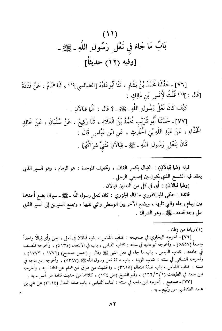 77 - حَدَّثَنَا أَبُو كُرَيْبٍ مُحَمَّدُ بْنُ الْعَلَاءِ قَالَ: حَدَّثَنَا وَكِيعٌ، عَنْ سُفْيَانَ، عَنْ خَالِدٍ الْحَذَّاءِ، عَنْ عَبْدِ اللَّهِ بْنِ الْحَارِثِ، عَنِ ابْنِ عَبَّاسٍ قَالَ: «§كَانَ لِنَعْلِ رَسُولِ اللَّهِ صَلَّى اللهُ عَلَيْهِ وَسَلَّمَ قِبَالَانِ مَثْنِيٌّ شِرَاكَهُمَا»