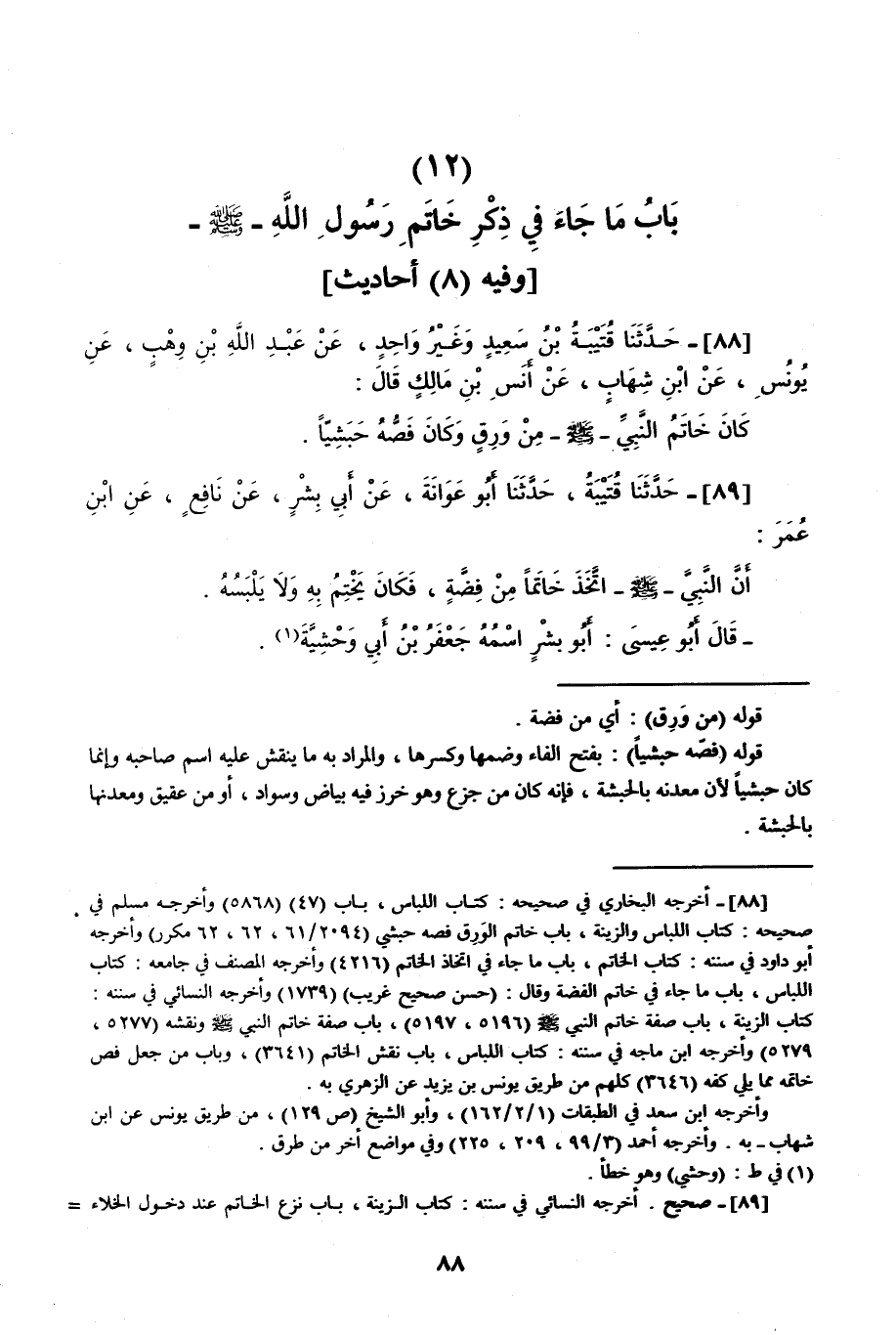 88 - حَدَّثَنَا قُتَيْبَةُ بْنُ سَعِيدٍ، وَغَيْرُ وَاحِدٍ، عَنْ عَبْدِ اللَّهِ بْنِ وَهْبٍ، عَنْ يُونُسَ، عَنِ ابْنِ شِهَابٍ، عَنْ أَنَسِ بْنِ مَالِكٍ قَالَ: «كَانَ §خَاتَمُ النَّبِيِّ صَلَّى اللهُ عَلَيْهِ وَسَلَّمَ مِنْ وَرِقٍ، وَكَانَ فَصُّهُ حَبَشِيًّا»