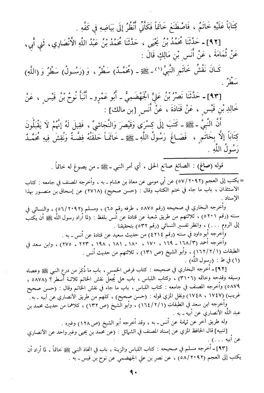93 - حَدَّثَنَا نَصْرُ بْنُ عَلِيٍّ الْجَهْضَمِيُّ أَبُو عَمْرٍو قَالَ: حَدَّثَنَا نُوحُ بْنُ قَيْسٍ، عَنْ خَالِدِ بْنِ قَيْسٍ، عَنْ قَتَادَةَ، عَنْ أَنَسِ بْنِ مَالِكٍ، أَنَّ النَّبِيَّ صَلَّى اللهُ عَلَيْهِ وَسَلَّمَ كَتَبَ إِلَى كِسْرَى وَقَيْصَرَ وَالنَّجَاشِيِّ، فَقِيلَ لَهُ: إِنَّهُمْ لَا يَقْبَلُونَ كِتَابًا إِلَّا بِخَاتَمٍ §فَصَاغَ رَسُولُ اللَّهِ صَلَّى اللهُ عَلَيْهِ وَسَلَّمَ خَاتَمًا حَلْقَتُهُ فِضَّةٌ، وَنُقِشَ فِيهِ: مُحَمَّدٌ رَسُولُ اللَّهِ "