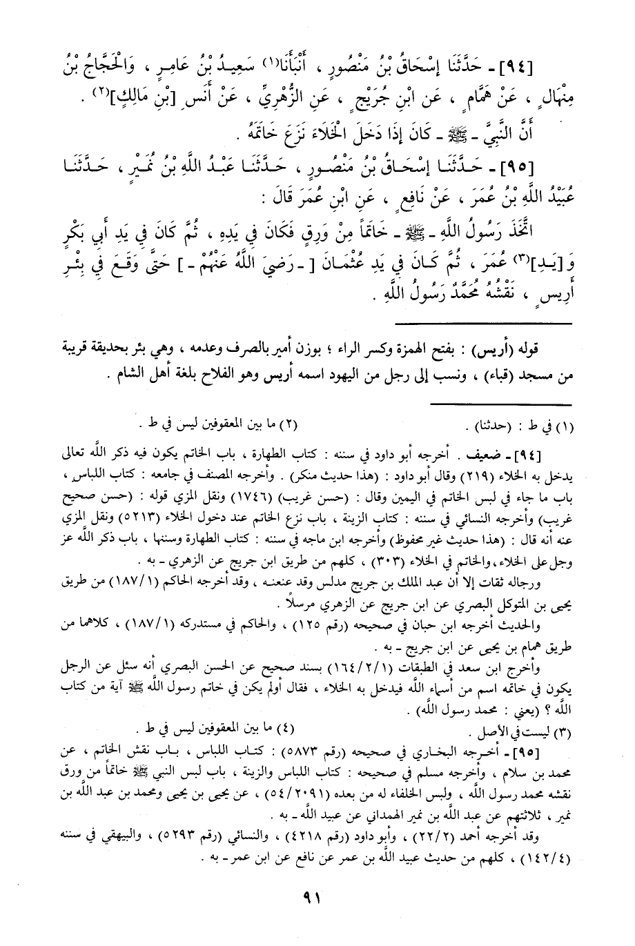 95 - حَدَّثَنَا إِسْحَاقُ بْنُ مَنْصُورٍ قَالَ: حَدَّثَنَا عَبْدُ اللَّهِ بْنُ نُمَيْرٍ قَالَ: حَدَّثَنَا عُبَيْدُ اللَّهِ بْنُ عُمَرَ، عَنْ نَافِعٍ، عَنِ ابْنِ عُمَرَ قَالَ: " §اتَّخَذَ رَسُولُ اللَّهِ صَلَّى اللهُ عَلَيْهِ وَسَلَّمَ خَاتَمًا مِنْ وَرِقٍ، فَكَانَ فِي يَدِهِ ثُمَّ كَانَ فِي يَدِ أَبِي بَكْرٍ، وَيَدِ عُمَرَ، ثُمَّ كَانَ فِي يَدِ عُثْمَانَ، حَتَّى وَقَعَ فِي بِئْرِ أَرِيسٍ نَقْشُهُ: مُحَمَّدٌ رَسُولُ اللَّهِ "