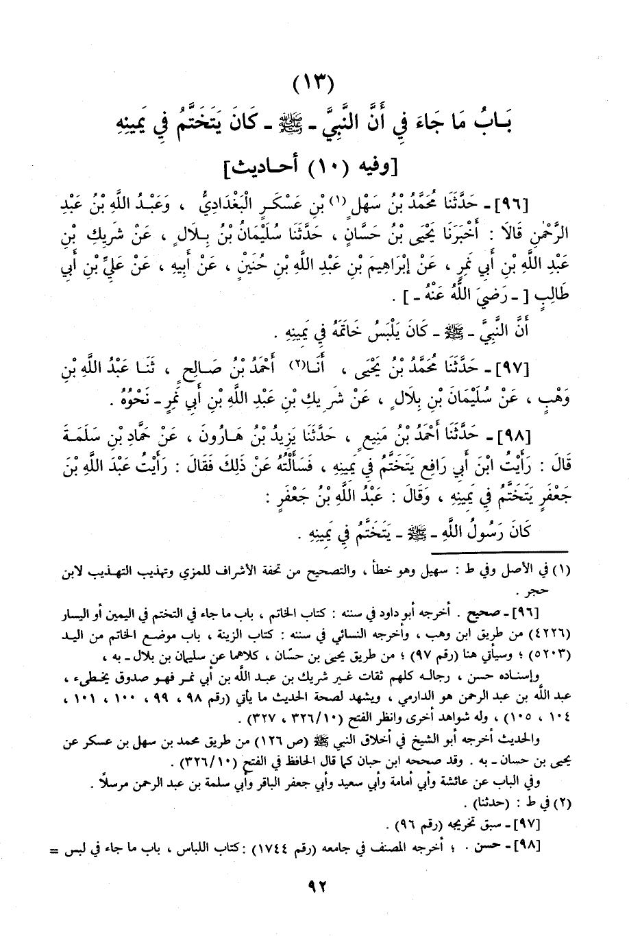 96 - حَدَّثَنَا مُحَمَّدُ بْنُ سَهْلِ بْنِ عَسْكَرٍ الْبَغْدَادِيُّ، وَعَبْدُ اللَّهِ بْنُ عَبْدِ الرَّحْمَنِ، قَالَا: أَخْبَرَنَا يَحْيَى بْنُ حَسَّانَ قَالَ: حَدَّثَنَا سُلَيْمَانُ بْنُ بِلَالٍ، عَنْ شَرِيكِ بْنِ عَبْدِ اللَّهِ بْنِ أَبِي نَمِرٍ، عَنِ إِبْرَاهِيمَ بْنِ عَبْدِ اللَّهِ بْنِ حُنَيْنٍ، عَنِ أَبِيهِ، عَنْ عَلِيِّ بْنِ أَبِي طَالِبٍ: أَنَّ النَّبِيَّ صَلَّى اللهُ عَلَيْهِ وَسَلَّمَ كَانَ §يَلْبَسُ خَاتَمَهُ فِي يَمِينِهِ "