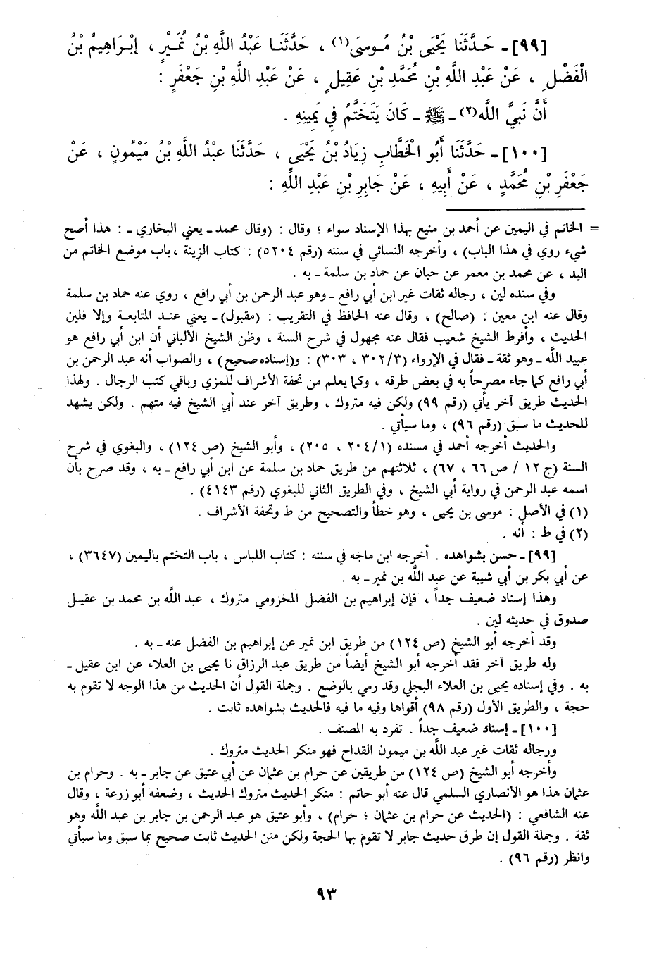 99 - حَدَّثَنَا يَحْيَى بْنُ مُوسَى قَالَ: حَدَّثَنَا عَبْدُ اللَّهِ بْنُ نُمَيْرٍ قَالَ: حَدَّثَنَا إِبْرَاهِيمُ بْنُ الْفَضْلِ، عَنْ عَبْدِ اللَّهِ بْنِ مُحَمَّدِ بْنِ عَقِيلٍ، عَنْ عَبْدِ اللَّهِ بْنِ جَعْفَرٍ: «أَنَّ النَّبِيَّ صَلَّى اللهُ عَلَيْهِ وَسَلَّمَ كَانَ §يَتَخَتَّمُ فِي يَمِينِهِ»