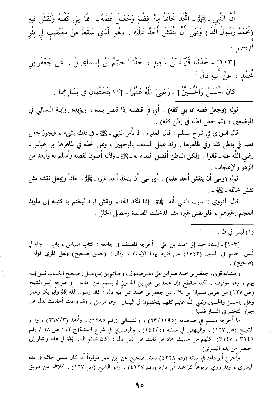103 - حَدَّثَنَا قُتَيْبَةُ بْنُ سَعِيدٍ قَالَ: حَدَّثَنَا حَاتِمُ بْنُ إِسْمَاعِيلَ، عَنْ جَعْفَرِ بْنِ مُحَمَّدٍ، عَنْ أَبِيهِ قَالَ: «§كَانَ الْحَسَنُ وَالْحُسَيْنُ يَتَخَتَّمَانِ فِي يَسَارِهِمَا»